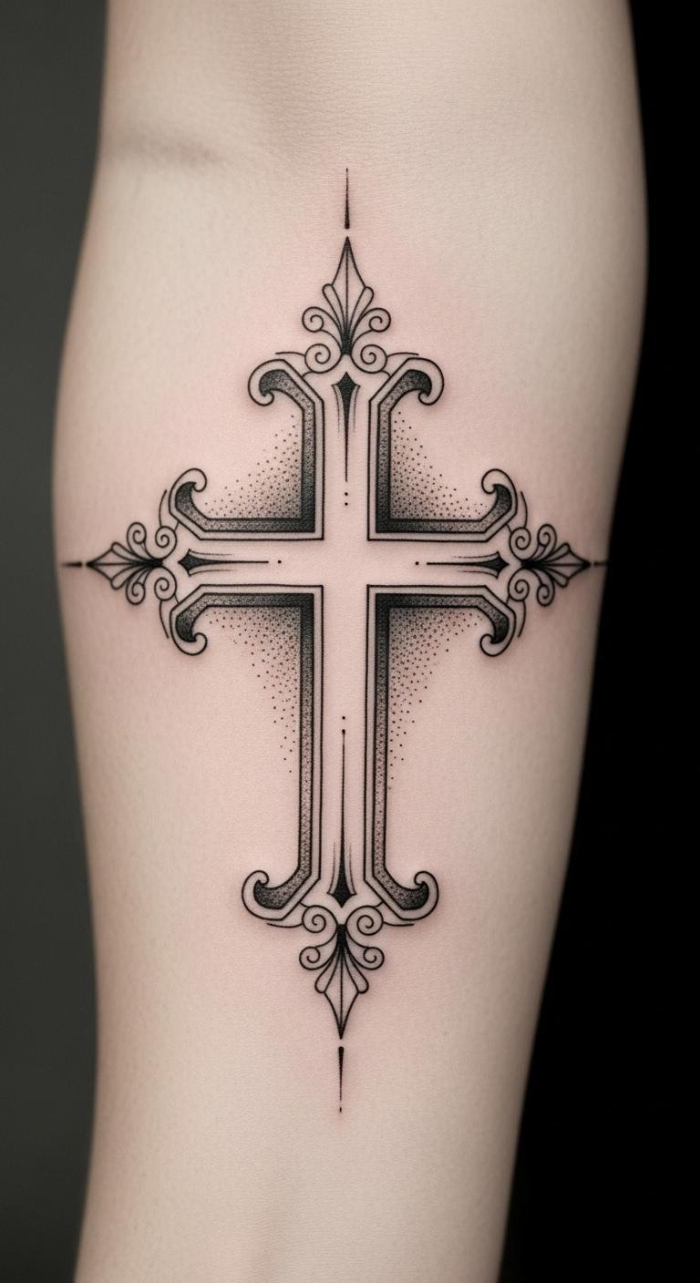This design resonates deeply, embodying cross tattoo symbolism that speaks of strength and devotion, making it a bold yet personal statement you’ll cherish forever.
