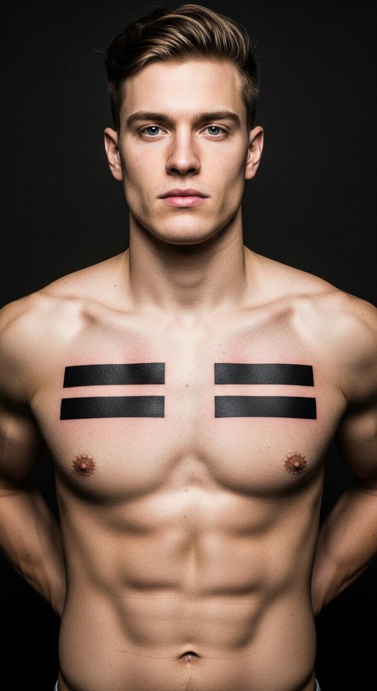 Bold and striking, two black bars on the chest create a powerful visual statement that exudes confidence and simplicity. This chest placement embodies tattoo symbolism of equality and balance, making it perfect for those who value minimalism. As a bold design, it accentuates your physique while conveying your personal philosophy, allowing you to express your individuality with ease and style. The parallel bars symbolize duality and equilibrium—strength and vulnerability—while their stark geometry evokes clarity and resolve; placed horizontally across the sternum they align with the heart, reinforcing themes of integrity and personal conviction, and their minimalist form elicits a calm, assertive emotion suited to visibly framing the upper torso.
