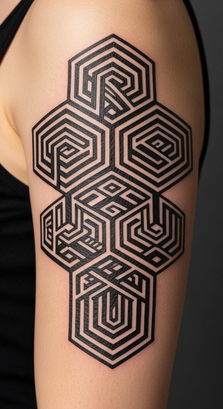 Six interconnected hexagons evoke unity, order, and fluid motion; place this tattoo where natural contours enhance the symmetry—along the forearm, across the shoulder blade, or centered on the sternum—to emphasize connection and balance.
