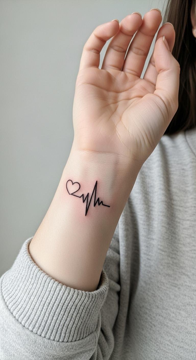 The tiny heartbeat line serves as a minimalist emblem of continuity and strength, carrying deep emotional resonance for wearers who tie it to relationships, survival, or transformative events; its medical waveform aesthetic communicates both vulnerability and endurance.