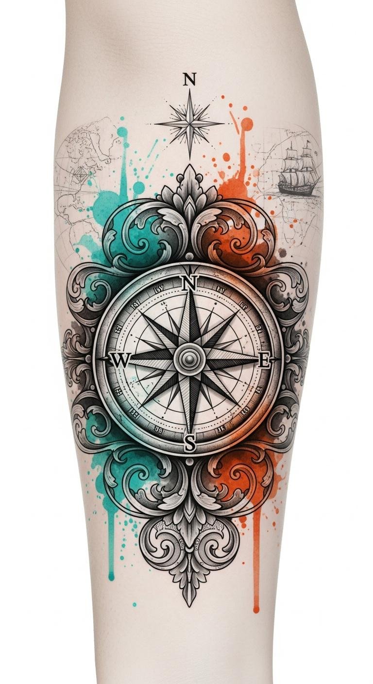 Steering life’s journey often leads to the desire for guidance, and an intricate compass design tattoo embodies this sense of direction and adventure.