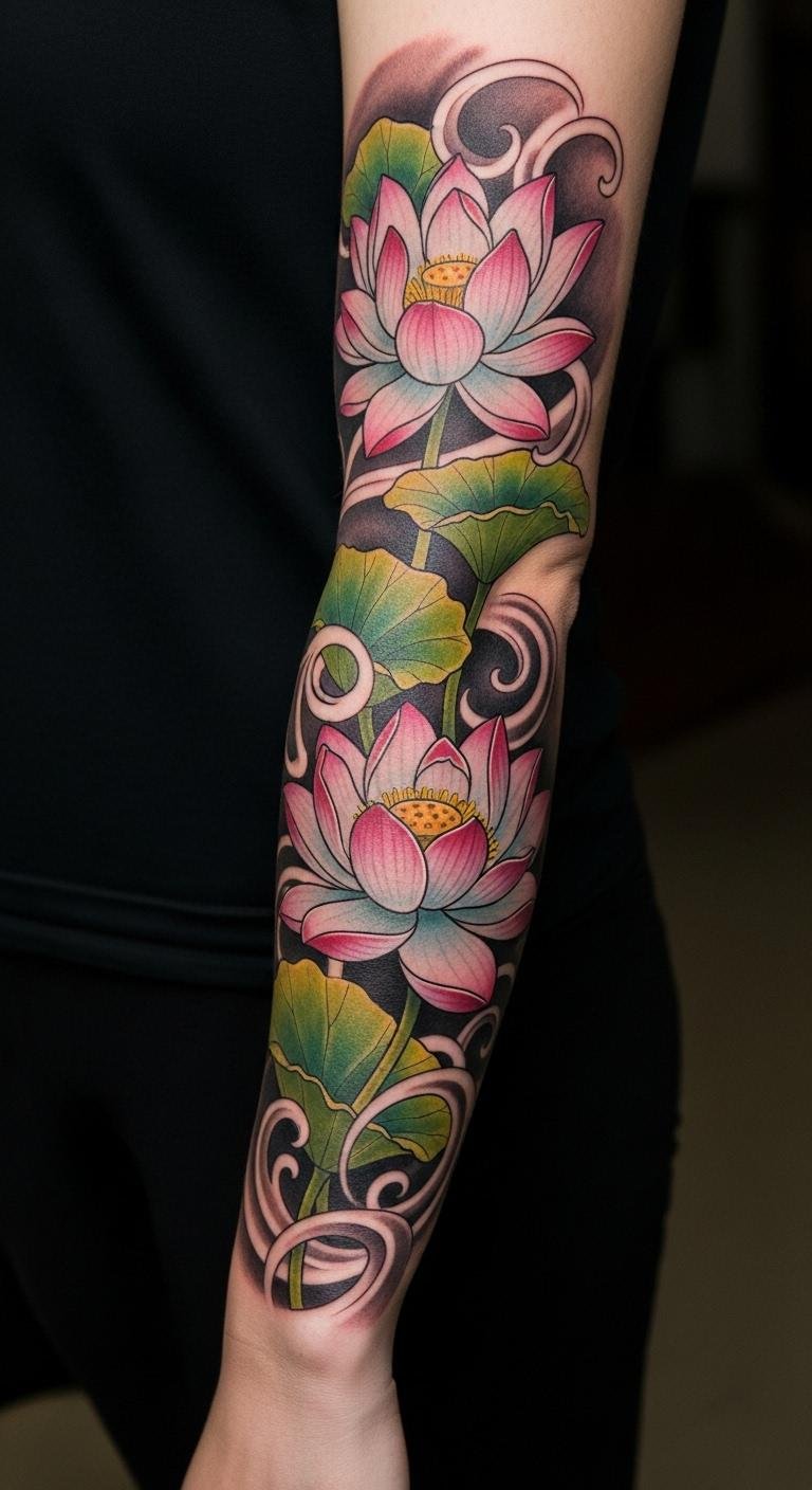Embodying purity and spiritual awakening, the lotus flower tattoo serves as a profound symbol of resilience and transformation. With its rich lotus symbolism, you can choose vibrant lotus colors that resonate with your personal significance. Popular flower placements include the forearm or chest, allowing for various design styles and tattoo techniques, each reflecting cultural references and deeper spiritual meaning that speaks to your journey.