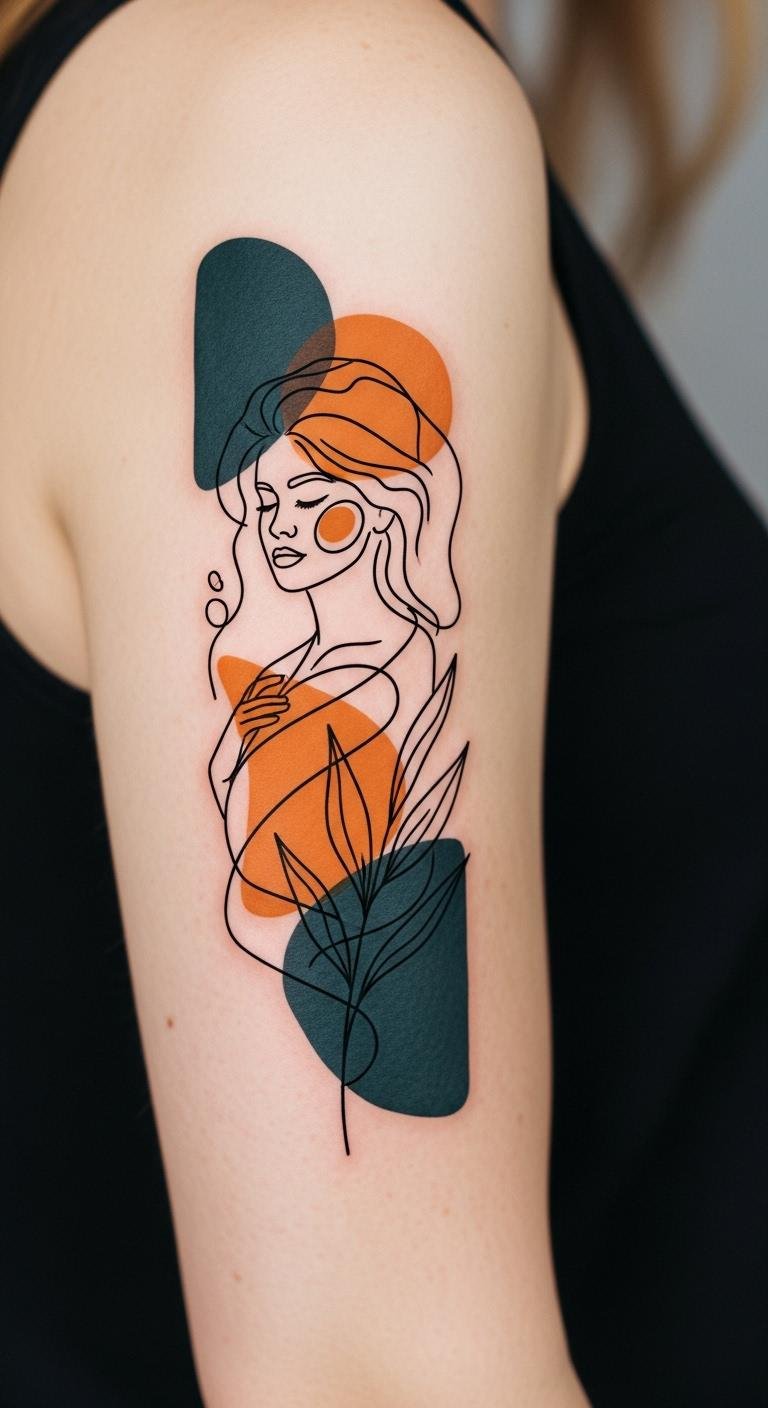 Abstract line work that flows along the curvature of the forearm or ribcage, combining a continuous single-line spiral that opens into fragmented geometric shards and soft negative-space crescents; thin, varying-weight black ink lines with occasional fine dot clusters and sparse color wash in muted ochre or teal to accent focal points. This piece symbolizes the balance between controlled form and spontaneous emotion, evoking introspection and resilience; its minimalist yet dynamic nature makes it suitable for placements that follow body movement (inner forearm, side torso, or clavicle), allowing the viewer to discover narrative details as the wearer shifts and interacts.