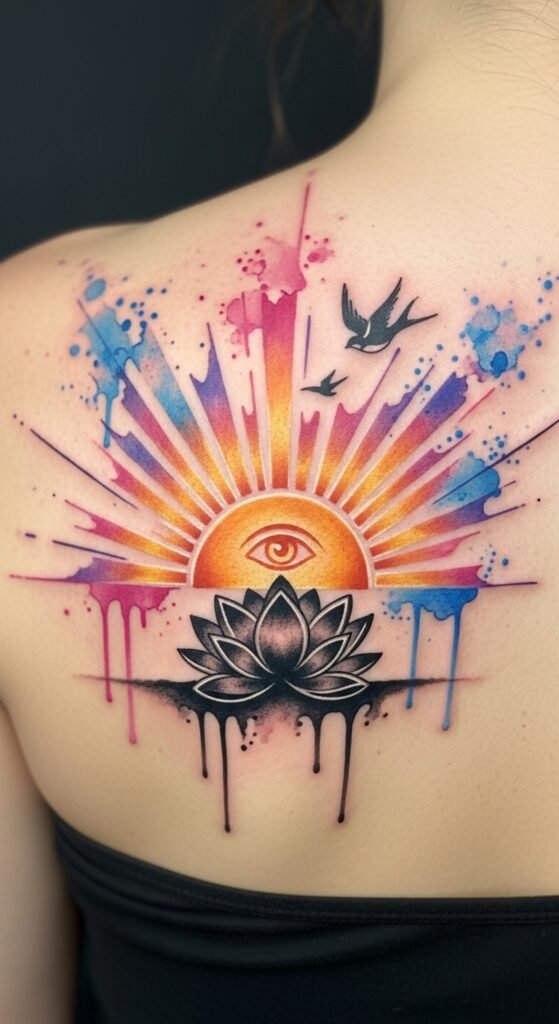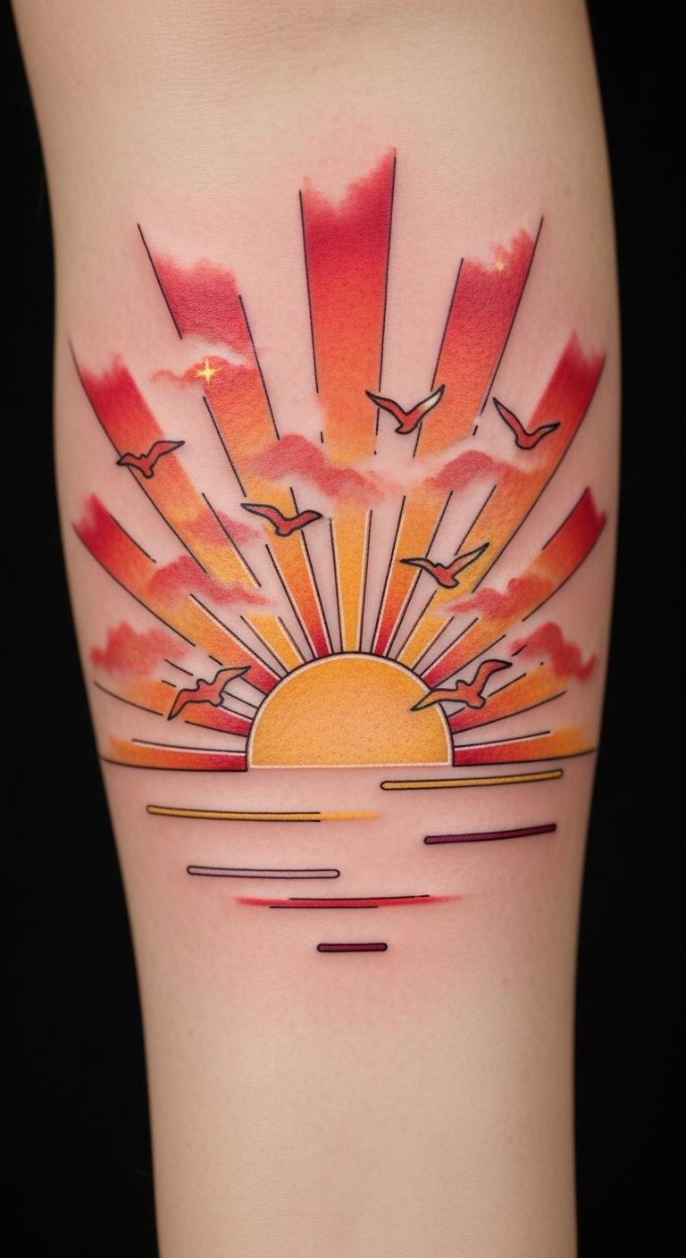 With their vibrant hues, these tattoos inspire you to chase dreams and transform, reminding you that every day offers a fresh canvas to paint your journey. This design emphasizes the emotional uplift of emergence and possibility—warm colors for optimism, birds for freedom, and geometric lines for personal structure—making it suitable for visible, motivating placements like the forearm or more intimate sites like the ribcage or upper back depending on whether you want daily reminder or private reflection.