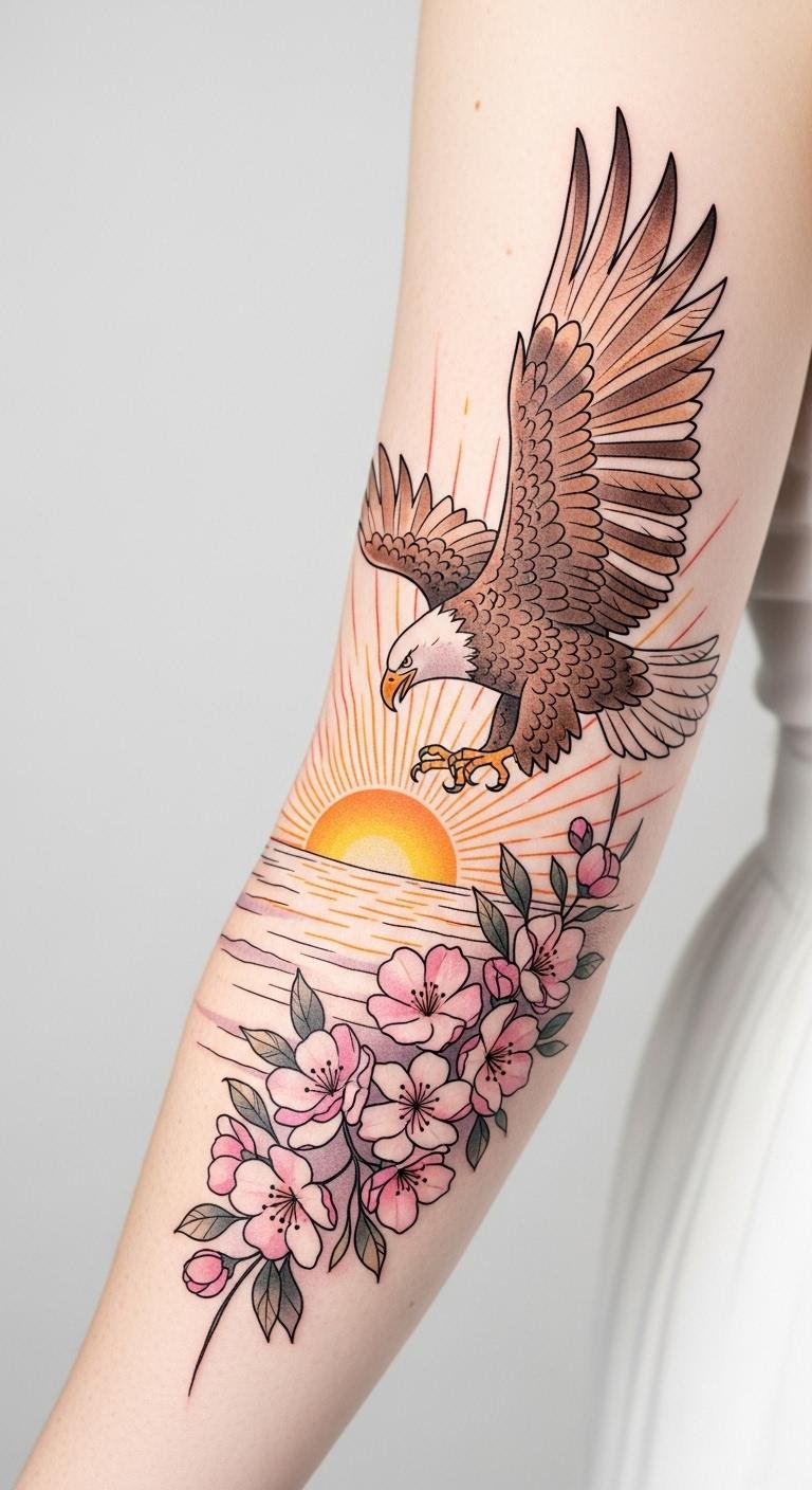 Consider tattoo pairings like a soaring eagle or blooming flowers, which enhance the sunrise symbolism of growth and freedom.