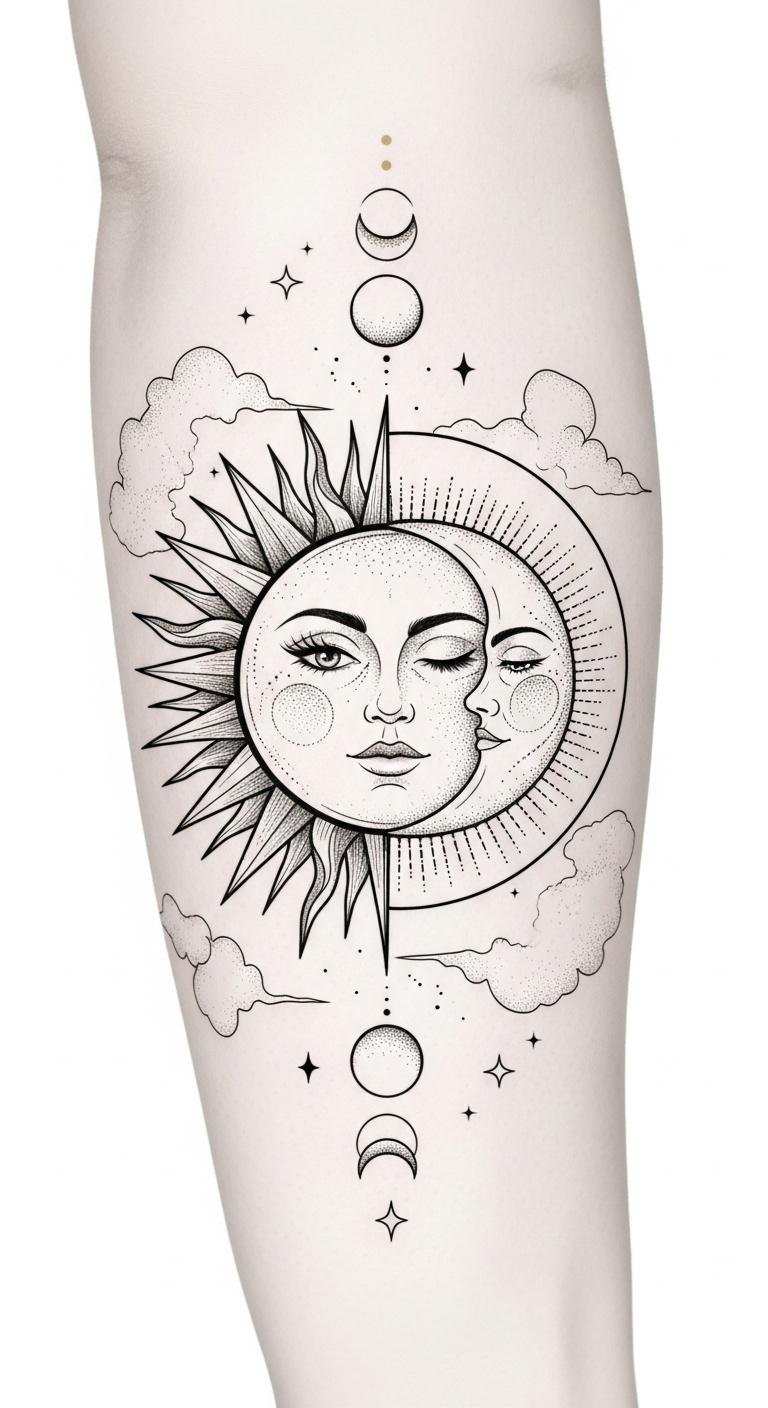 Building on the idea of combining sunrise tattoos with other elements, the pairing of sun and moon tattoos creates a fascinating dialogue between light and darkness.