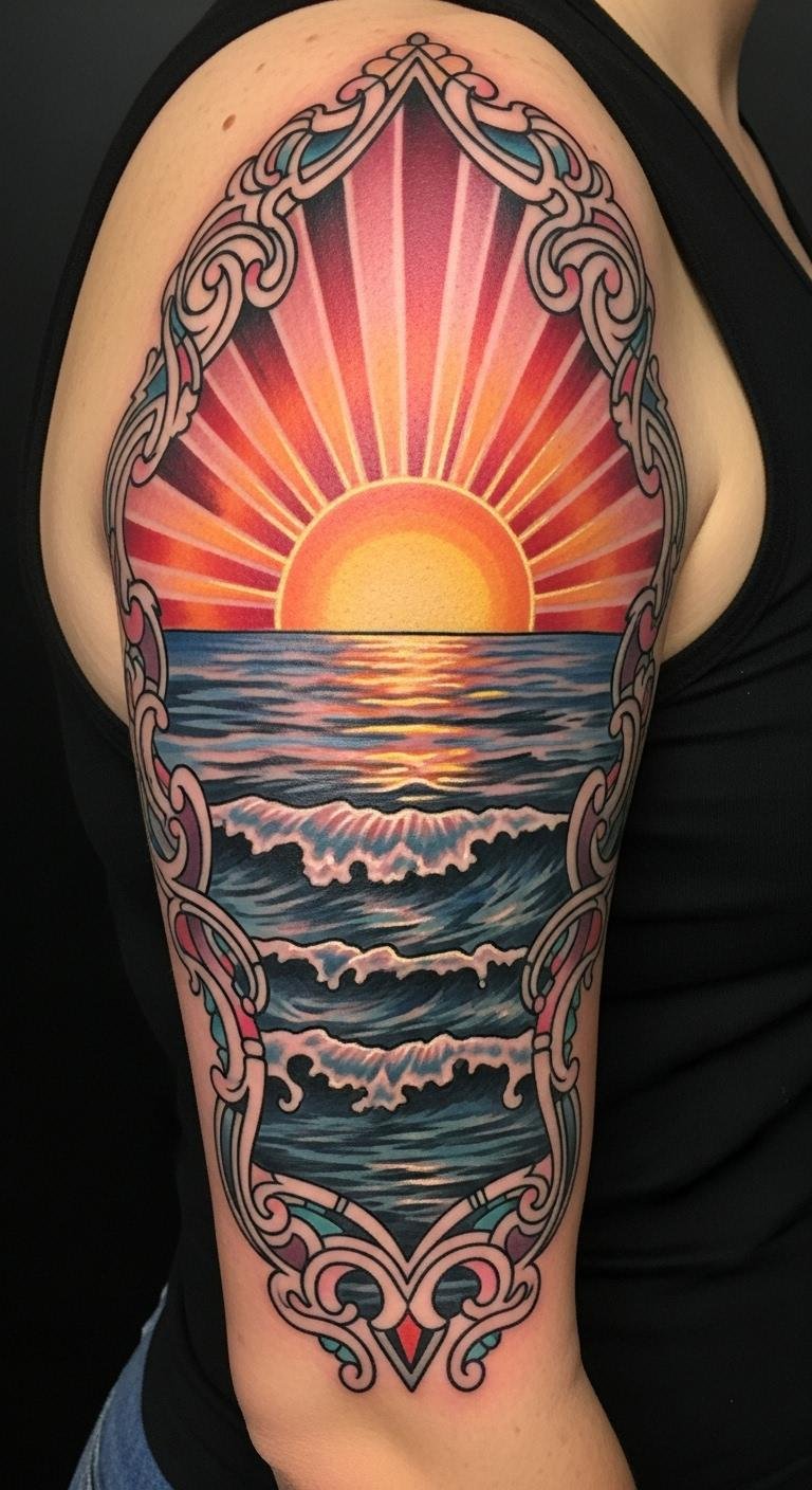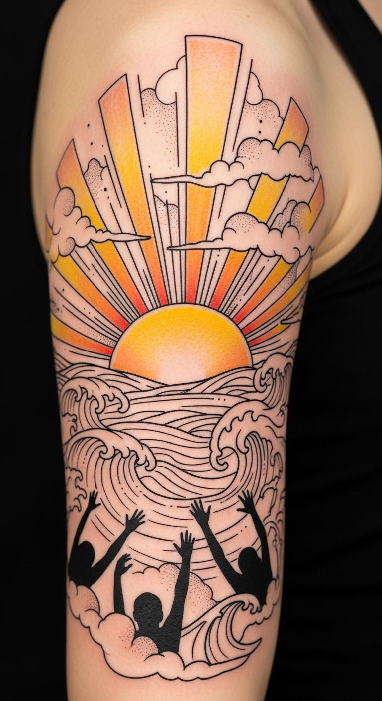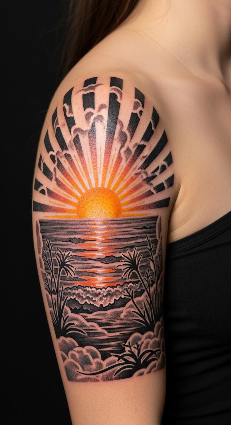 Joy and optimism radiate from sunrise tattoos, capturing the essence of new beginnings and the promise each day holds.