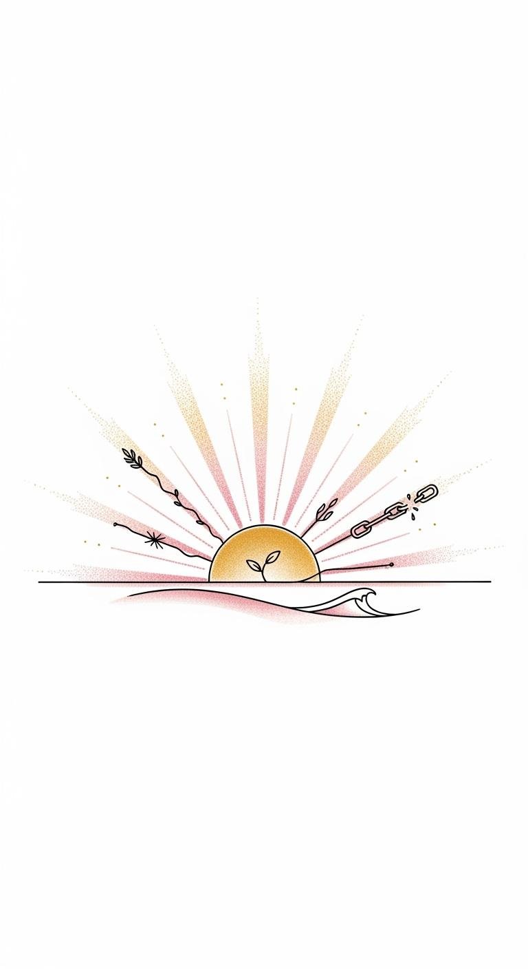 This design uses the rising sun and path to symbolize transition and guided progression from darkness to light. The watercolor hues evoke warmth and gentle optimism, and the dotted sparkles hint at small moments of clarity.