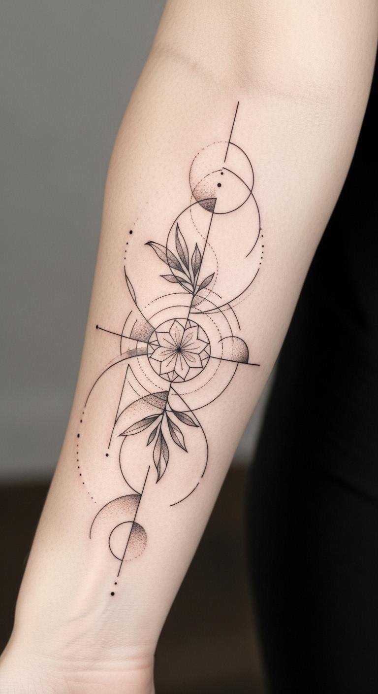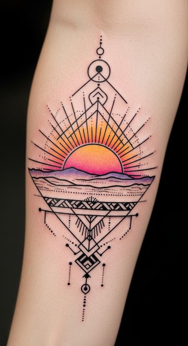 These tattoos embody sunrise symmetry through intricate geometric patterns that radiate energy and balance. The sharp lines and shapes create a modern twist on the classic sunrise, capturing the essence of hope and renewal.