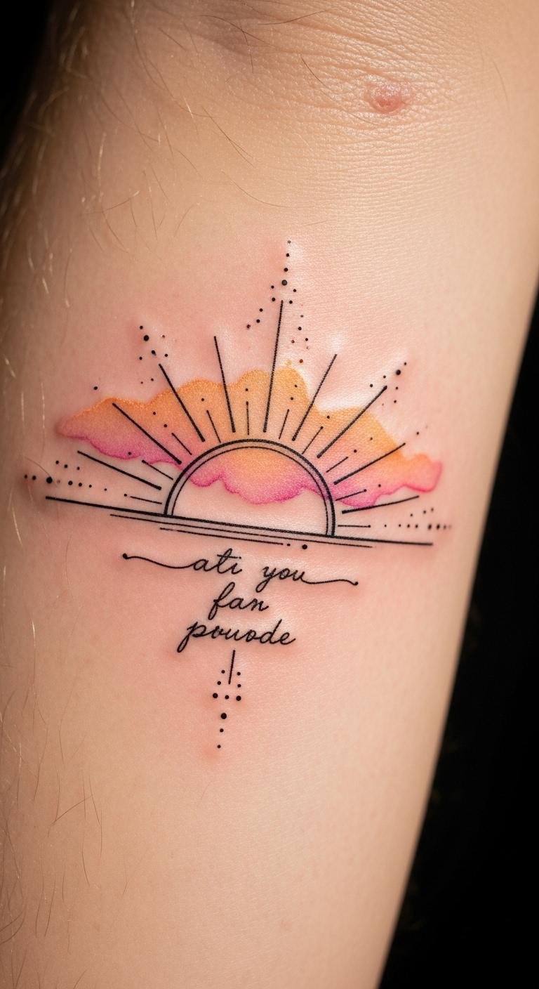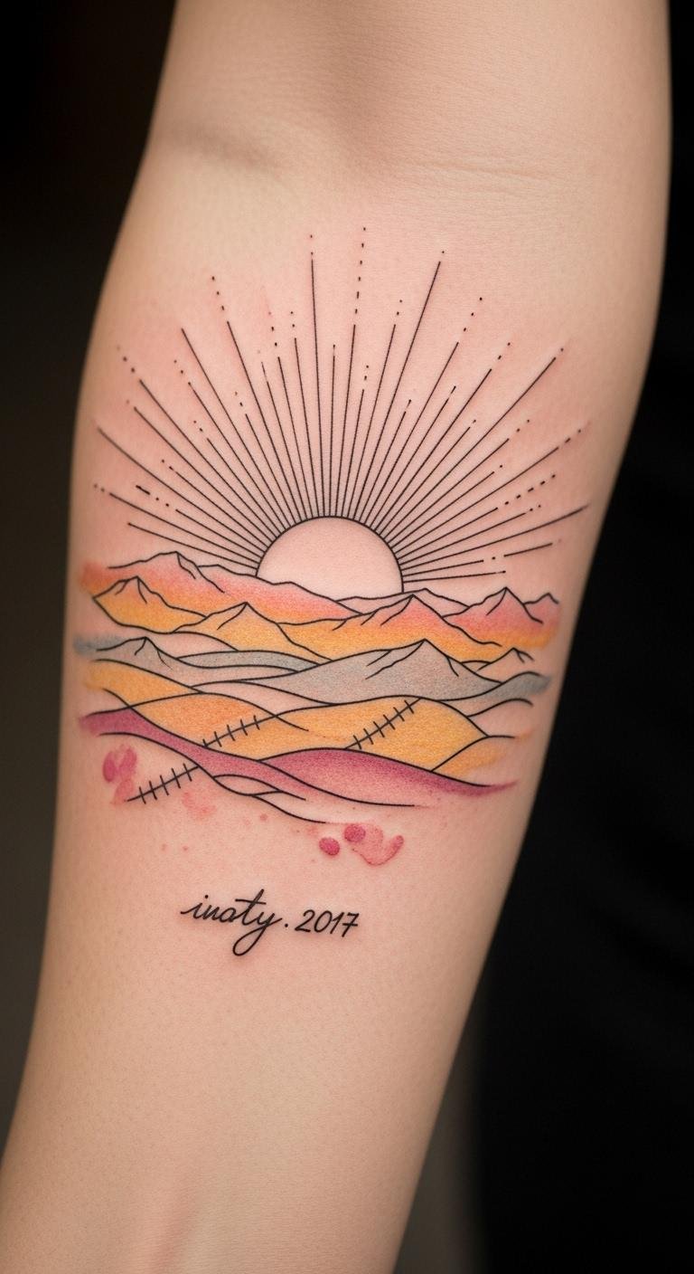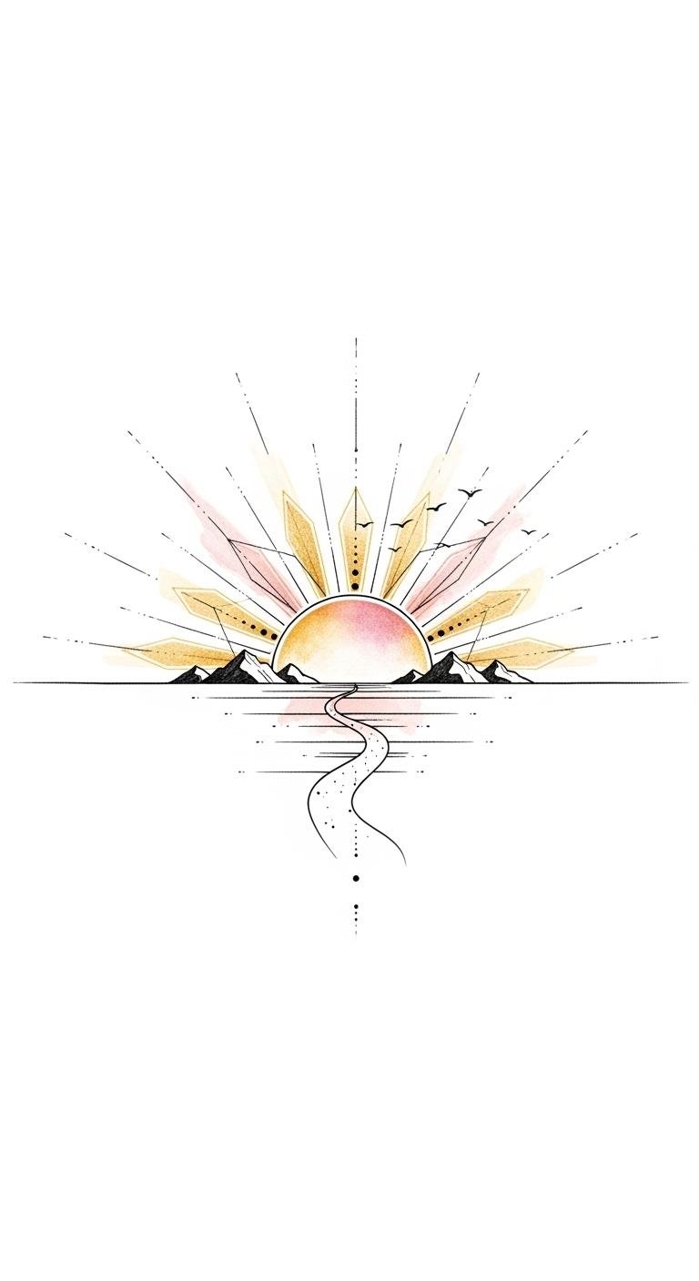 The sunrise tattoo concept blends symbolism of hope and renewal with layered stylistic elements to evoke a personal narrative: minimalist lines convey clarity and new beginnings, watercolor washes express emotional warmth and fluidity, and bold traditional lines add strength and permanence; geometric shapes and tribal motifs introduce structure and ancestral connection while the small landscape grounds the piece in place and memory.