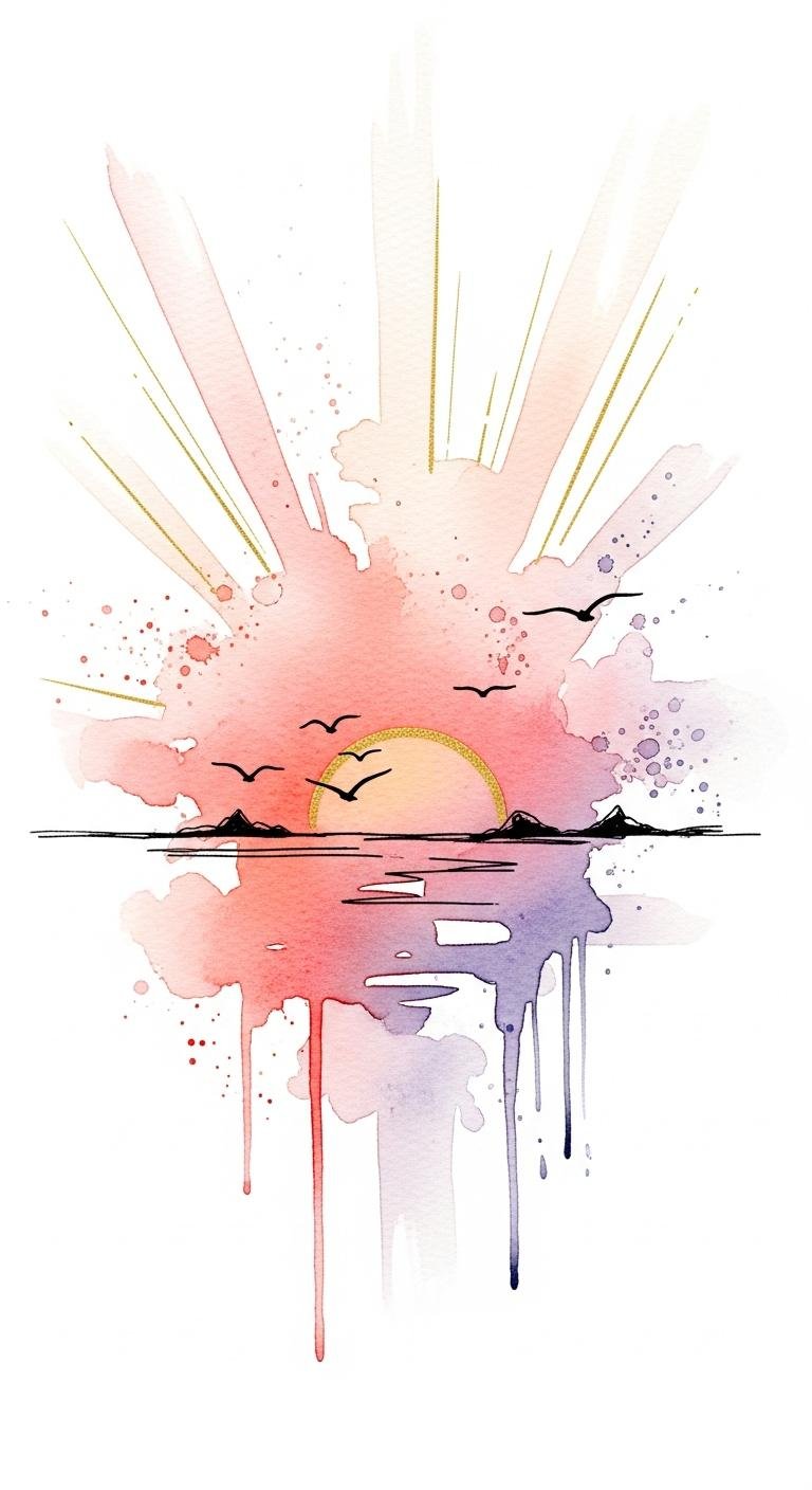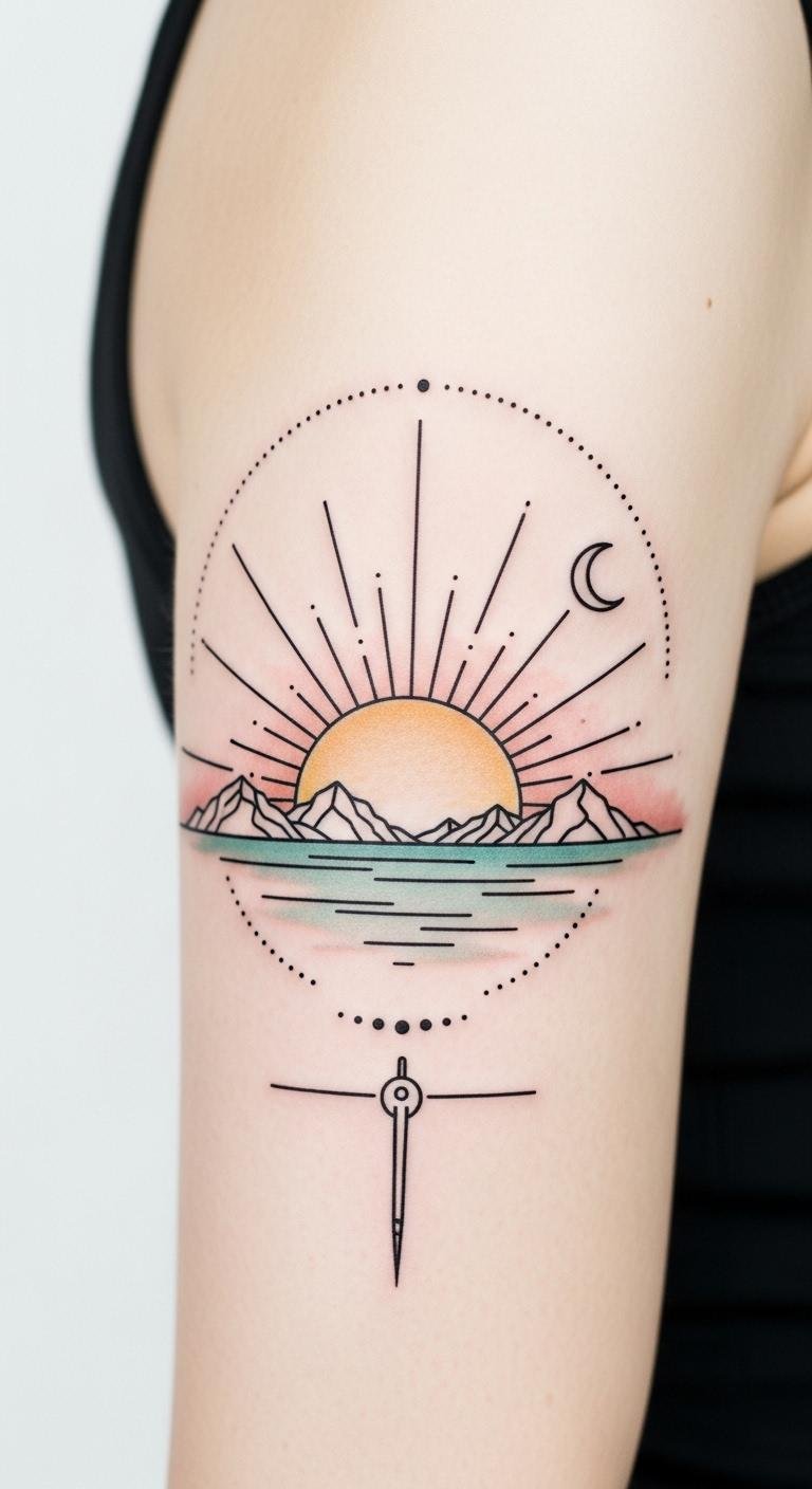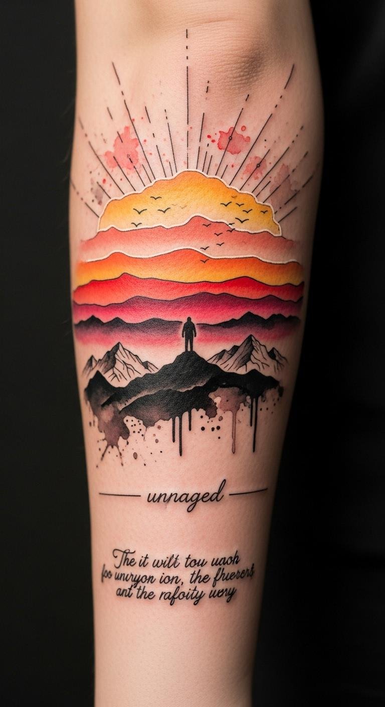 The sunrise tattoo concept blends symbolism of hope and renewal with layered stylistic elements to evoke a personal narrative: minimalist lines convey clarity and new beginnings, watercolor washes express emotional warmth and fluidity, and bold traditional lines add strength and permanence; geometric shapes and tribal motifs introduce structure and ancestral connection while the small landscape grounds the piece in place and memory.