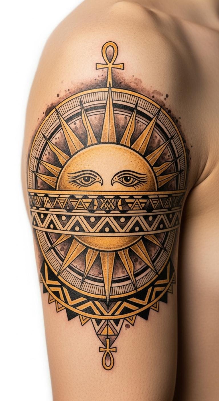 Ideal placement is the forearm for a personal emblem or the upper back for a more monumental statement, sized to allow the detailed rays and glyph-like bands to remain crisp.