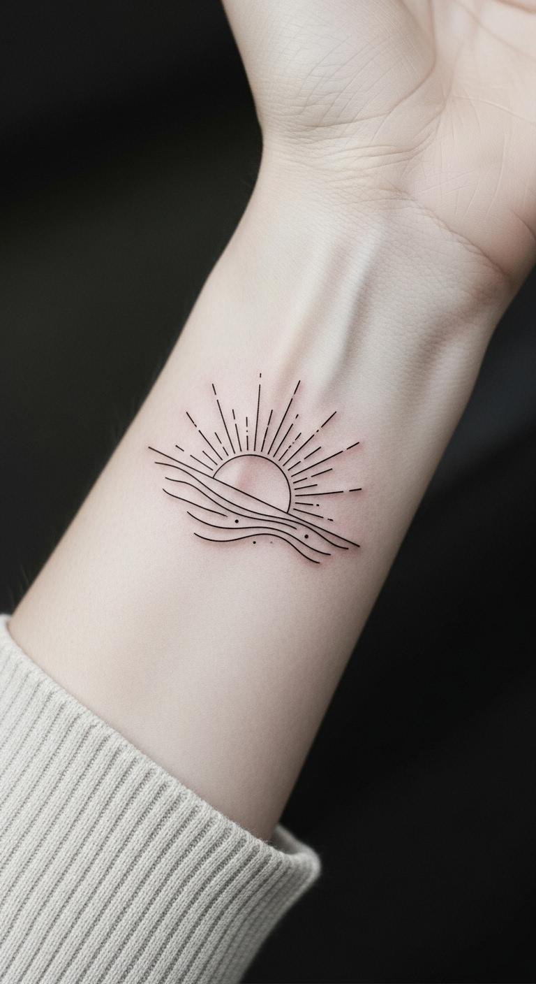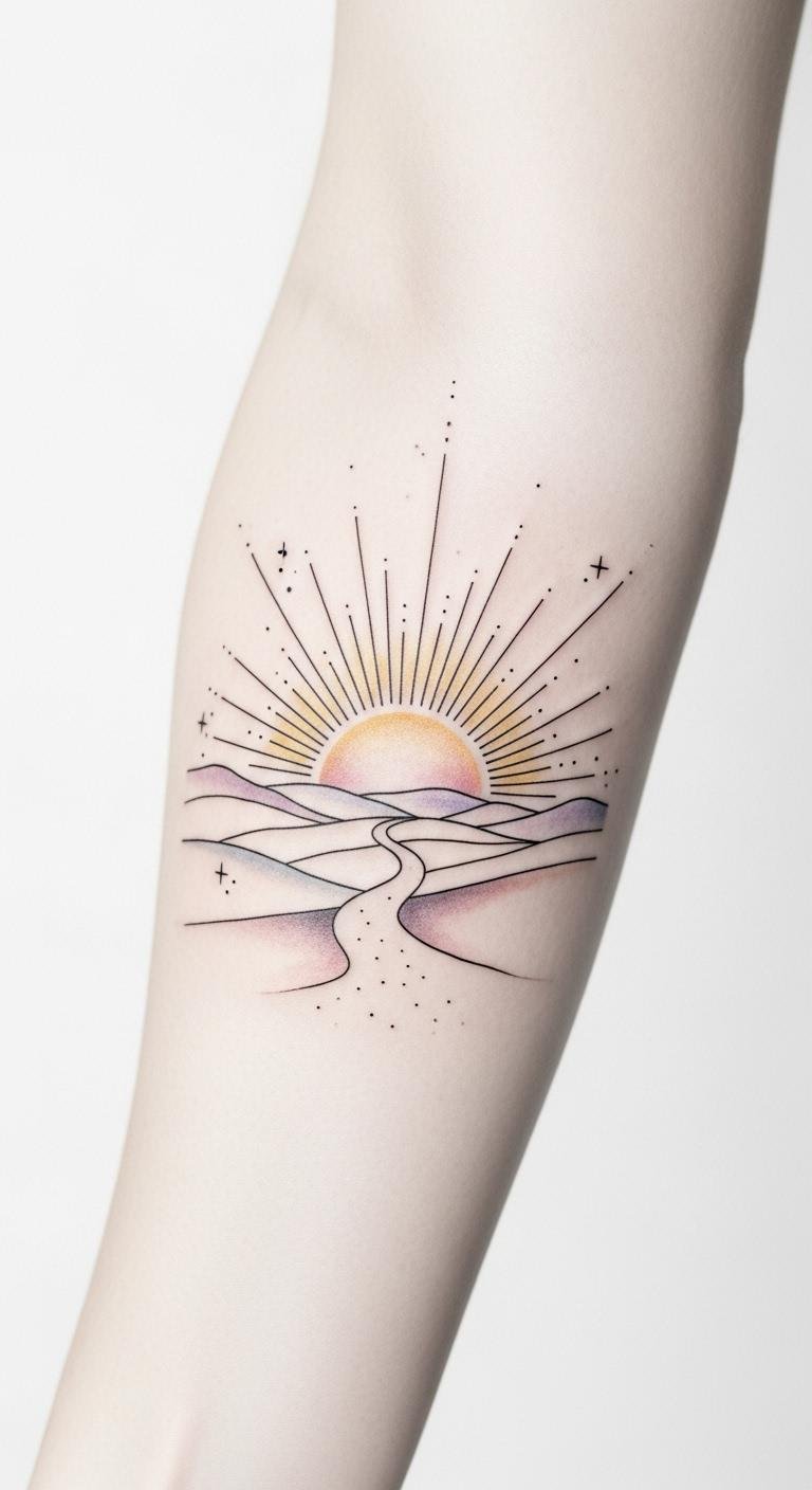 This concept uses the sunrise motif to symbolize renewal, optimism, and personal growth; placing it on the forearm or wrist keeps that reminder in view during everyday moments, fostering resilience and gentle encouragement.