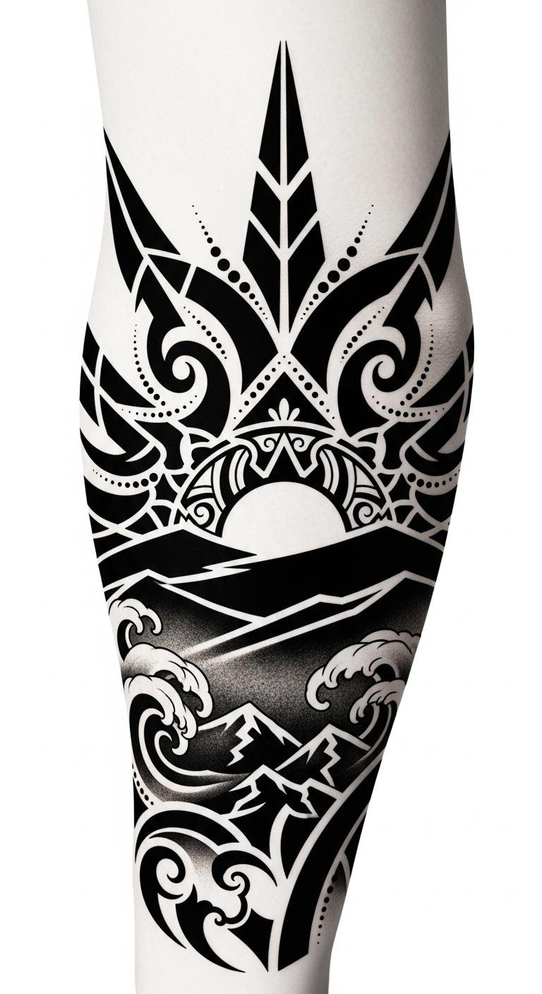 This design blends bold tribal geometry and negative space to evoke ancestral strength and the optimism of new beginnings; placed on the forearm it becomes a visible personal emblem of resilience and daily renewal, while on the upper back it reads as a guardian motif, centered and symmetrical to convey balance and protection.