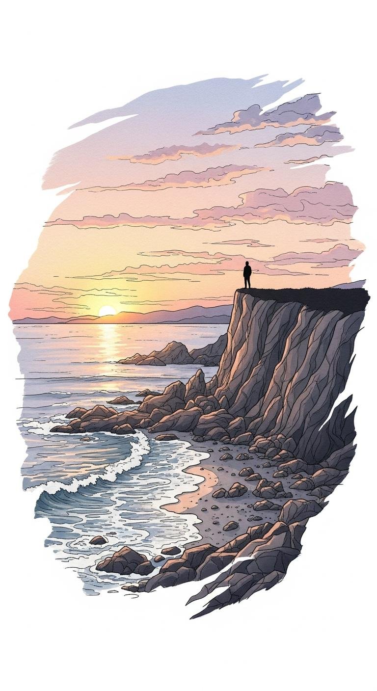 This design symbolizes renewal, resilience, and the quiet bravery of beginning again; the rising sun stands for hope and possibility, the lone figure suggests personal journey and introspection, and the coastal elements convey freedom and the flow of life.