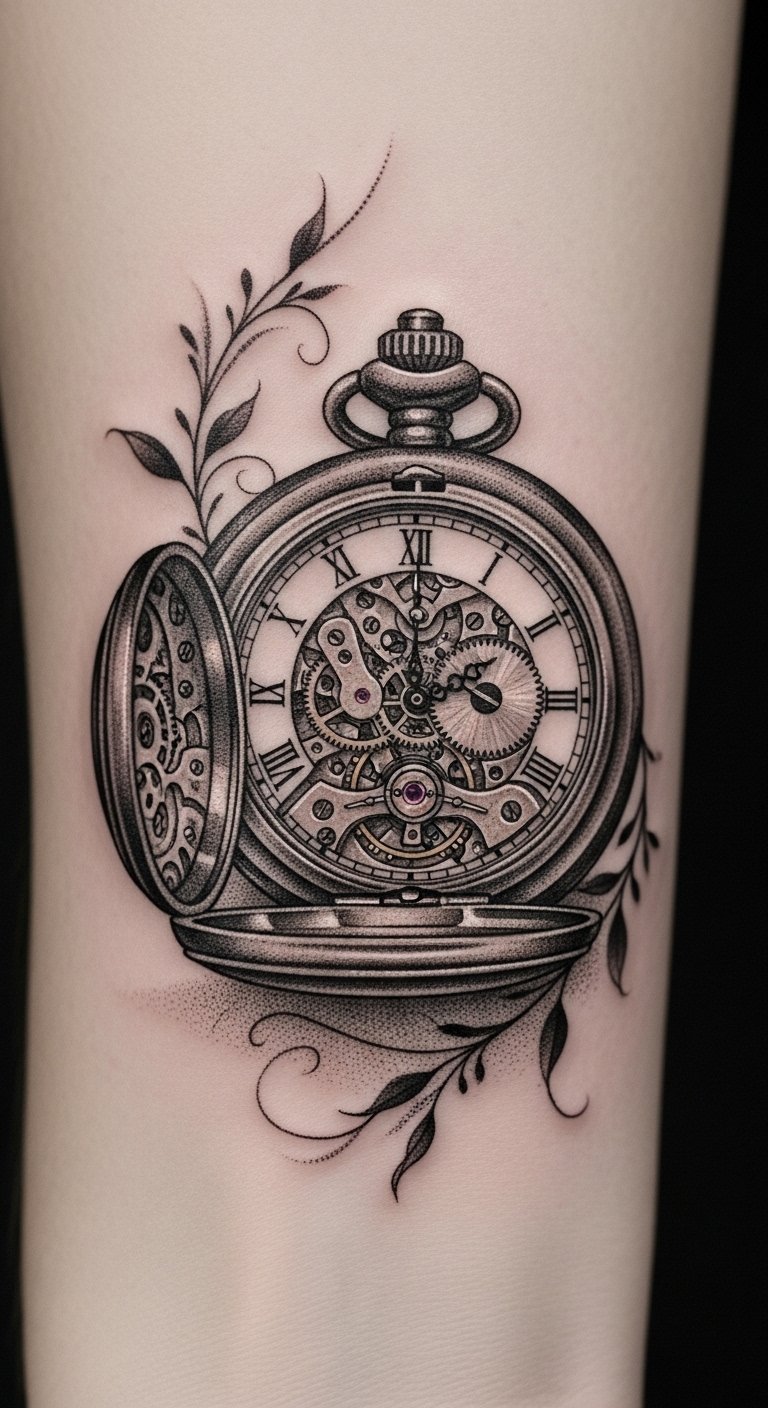 The pocket watch symbolizes time, memory, and moments kept close; the entwined floral vine softens the mechanical edges and represents growth and continuity.