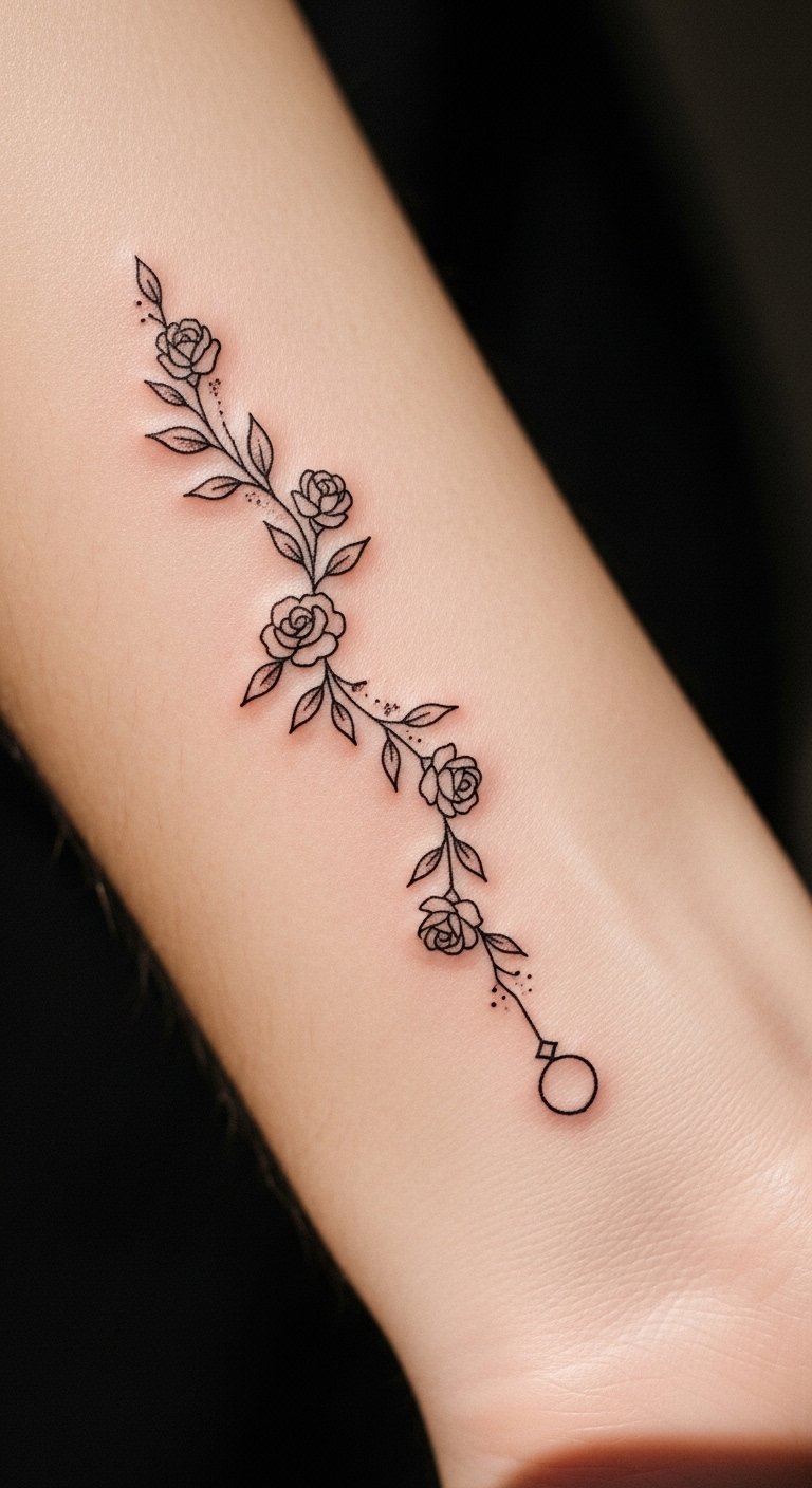 The design symbolizes personal growth and openness—the winding rose vine for resilience and beauty, the open circle for possibility and self-acceptance—evoking quiet confidence and gentle vulnerability; ideal for an inner wrist placement where it remains intimate yet visible, wrapping slightly toward the forearm to convey continuity and movement.