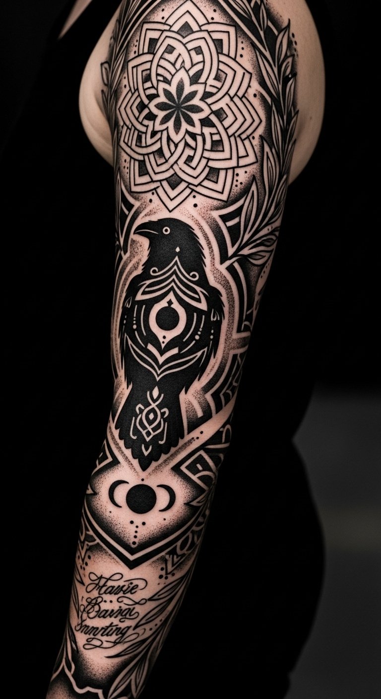 Placed to wrap from inner forearm up over the elbow to the shoulder cap, the contrast of heavy lines with delicate dotwork creates emotional depth—strength, individuality, and an open invitation to let one’s skin tell a personal story.