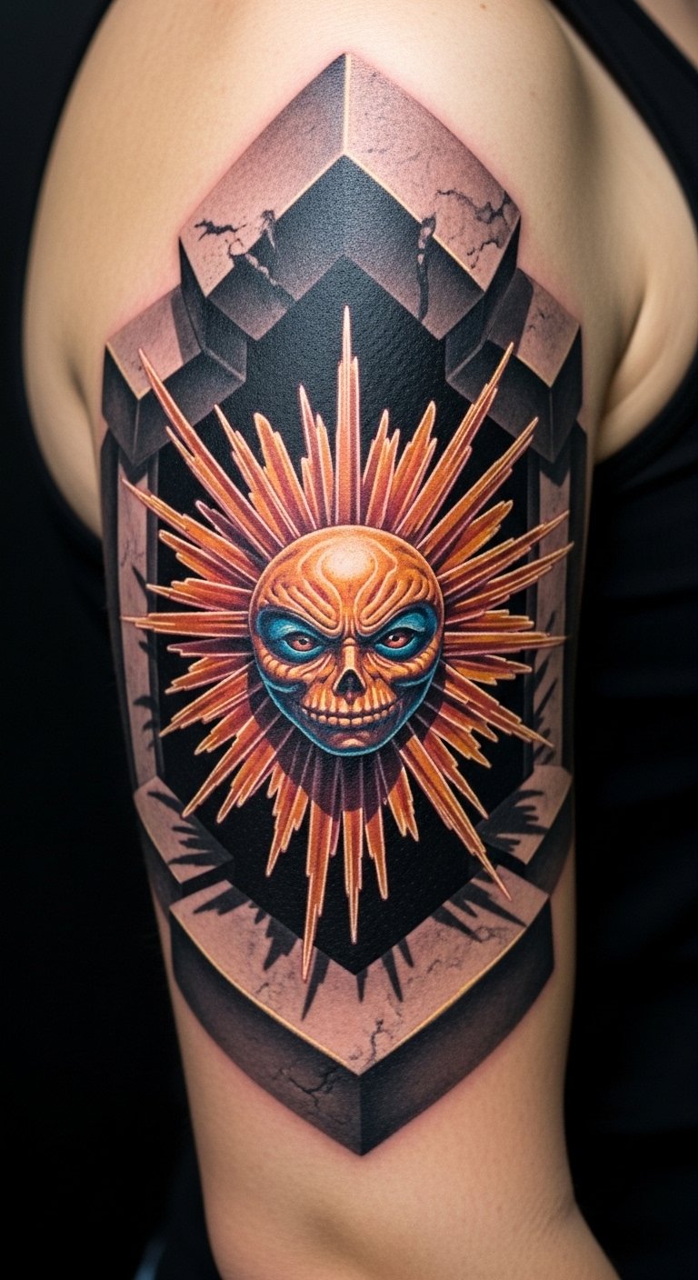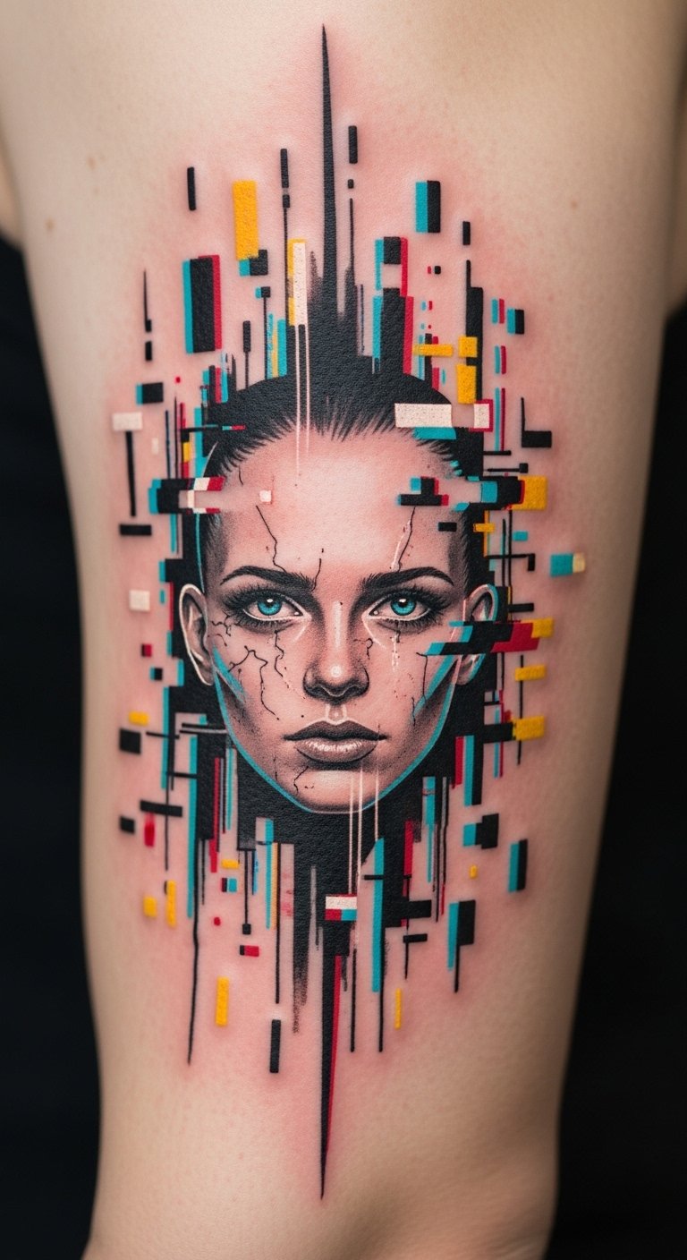 A sleeve or upper-back tattoo that layers pixelated circuitry, fragmented portraits, and cascading color bars in neon cyan, magenta, and electric yellow, with deliberate misalignments and scanline effects to evoke digital malfunction; place the focal distorted portrait over the shoulder blade or outer forearm so the glitch fragments seem to peel across muscle contours. Symbolically this design juxtaposes human identity and technological influence, expressing resilience through visible “errors” and celebrating imperfect uniqueness; emotionally it feels provocative and playful, a statement of modern rebellion and personal evolution, and placement on a torso or limb allows interaction with movement, making the glitches shift as the body moves.