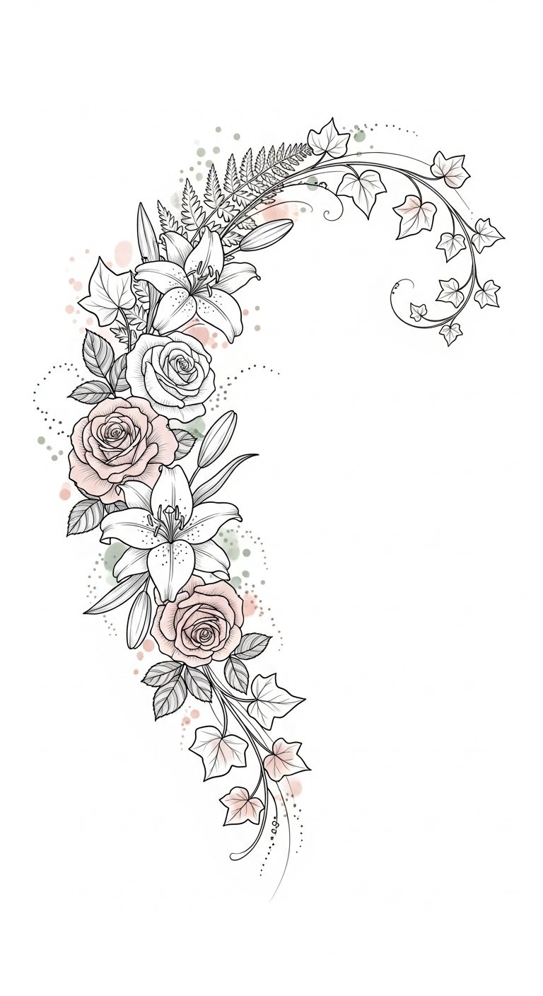 The composition emphasizes personal narrative through classic symbols: roses for enduring love, lilies for purity and renewal, ivy for connection and resilience, and ferns for new beginnings.