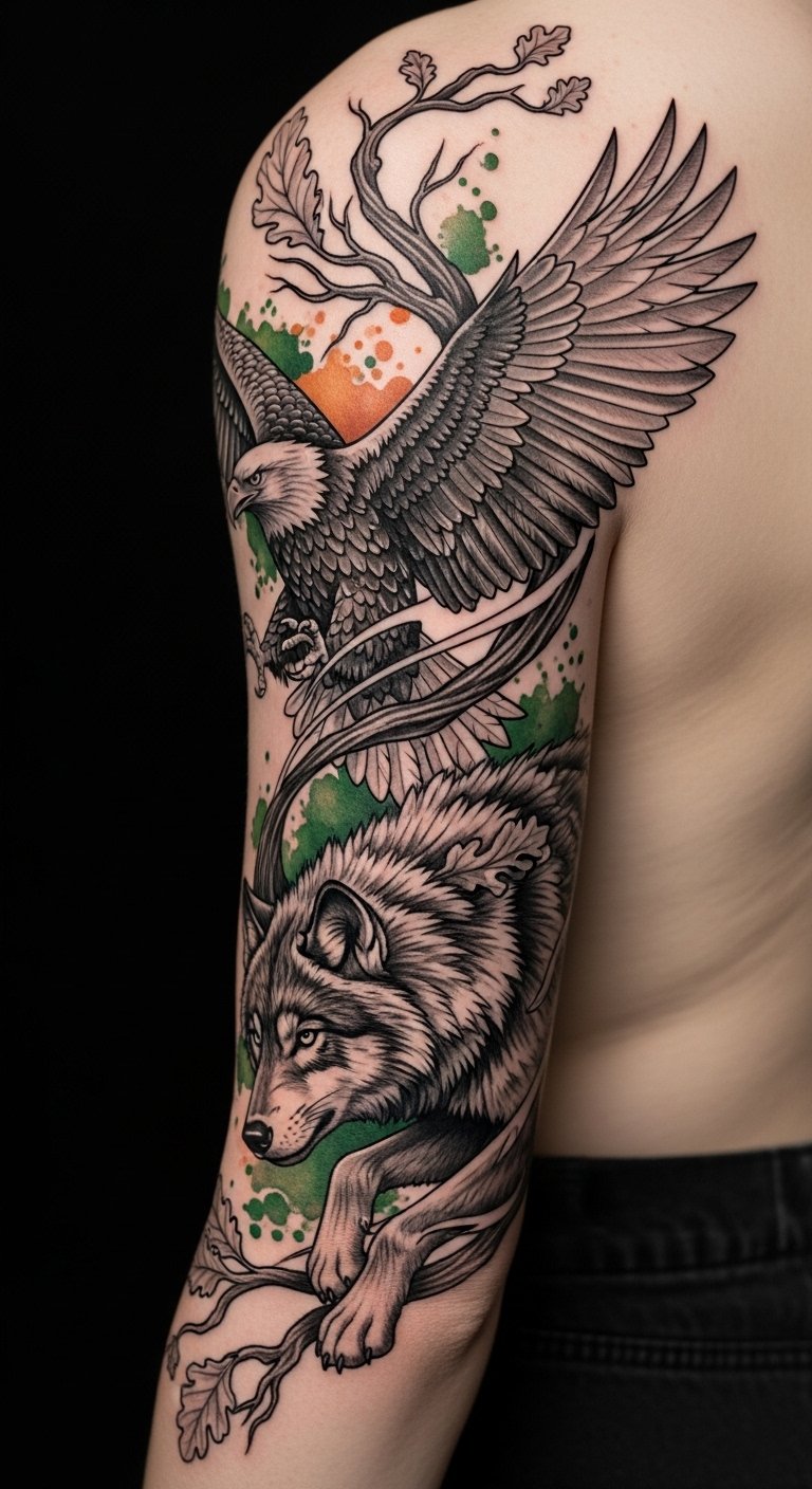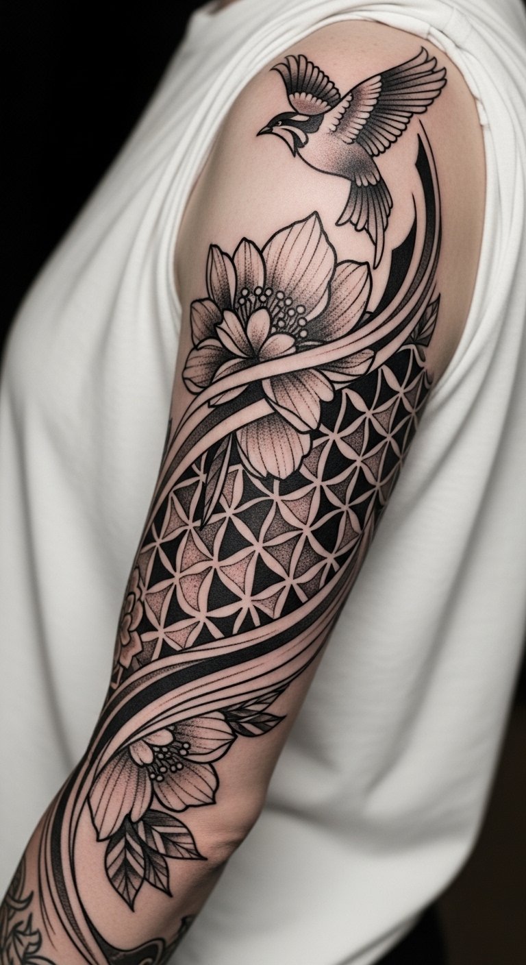This design concept channels that exploration into a cohesive piece: the forearm sleeve uses bold florals and precise geometric patterns to represent growth and structure, while the shoulder’s soaring bird evokes freedom and adventure.