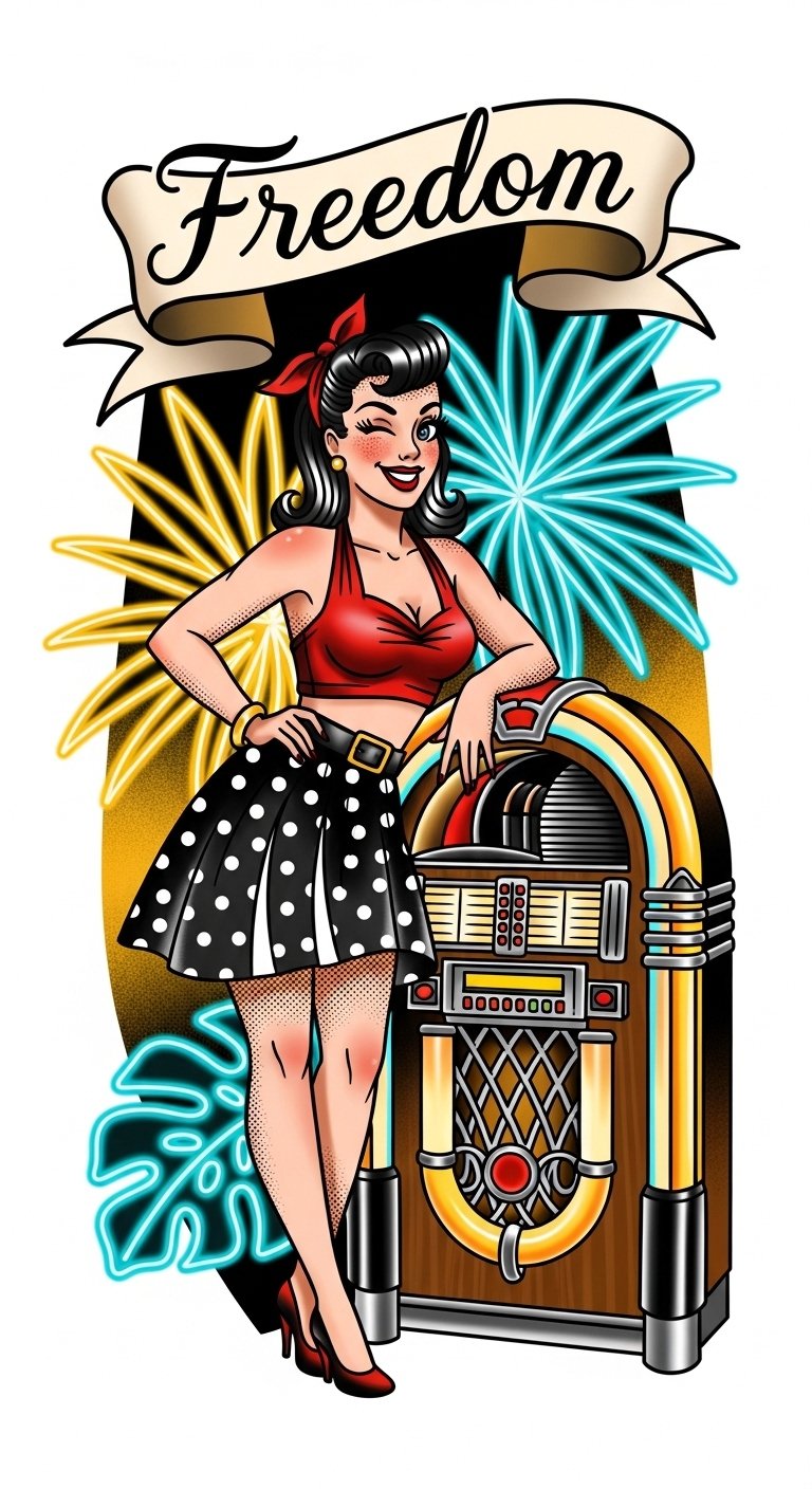 The design symbolizes a celebration of individuality and nostalgia—pin-up charm representing confidence and playful rebellion, the jukebox as a beacon of joyful memories and musical freedom, and neon palms invoking carefree, sun-soaked days.