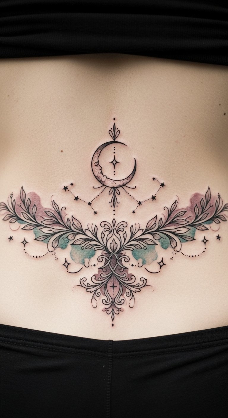 The design marries natural growth and cosmic guidance—flowers symbolize renewal and personal blossoming, the crescent moon and constellations evoke intuition and connection to the wider universe—while the filigree and watercolor soften intensity to convey grace and vulnerability; positioned along the lumbar curve it accentuates the body’s movement and becomes a private emblem of empowerment and self-expression.