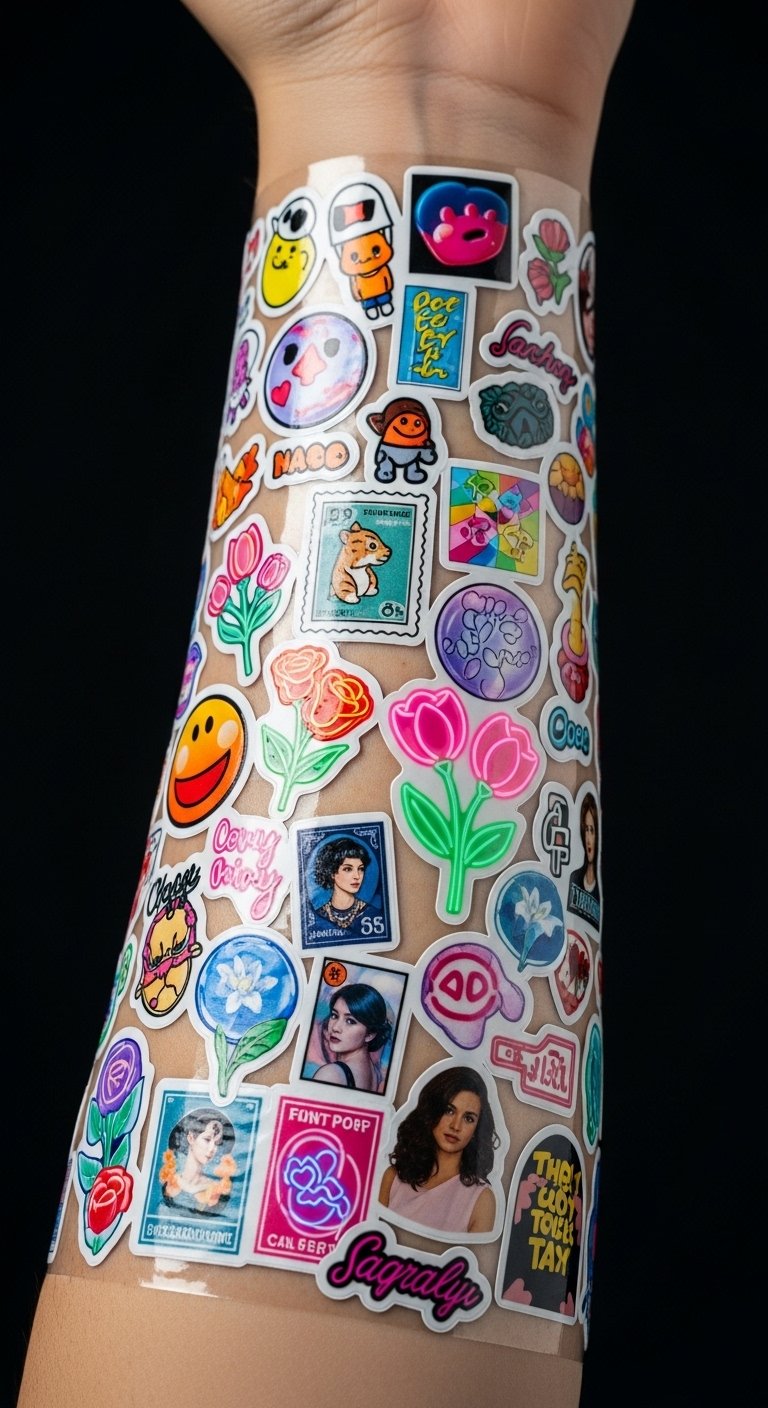 Embrace this trend and let your skin become a canvas of creativity and freedom! This design concept blends nostalgic playfulness with personal storytelling: each sticker element functions as a memory token or emblem, layered to show how identities accumulate and overlap.