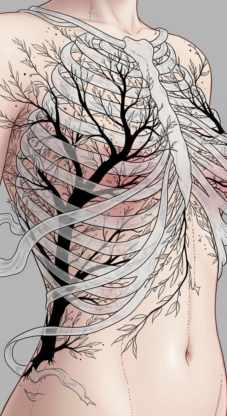 The willow branches symbolize resilience and quiet strength, the silk ribbons suggest movement and personal ties, and the negative-space constellations hint at private guidance; emotionally the design balances vulnerability and confidence, meant to sit along the ribcage and side so it remains intimate yet visible when you choose, flowing naturally with body contours for an elegant, concealed impact.