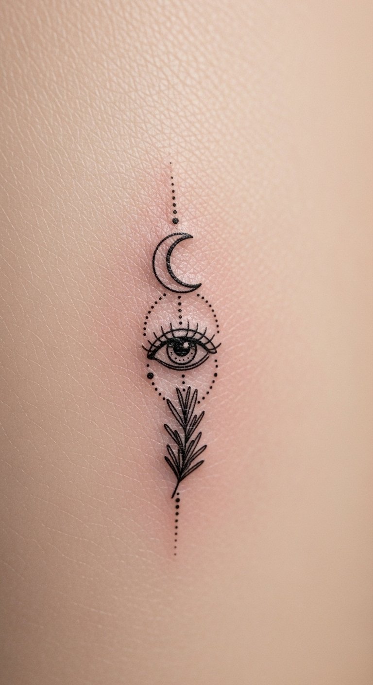 Each element reflects the original passage’s celebration of subtle beauty and hidden meaning: the crescent moon suggests quiet introspection and cycles, the open eye invites curiosity and wonder, and the rosemary sprig symbolizes remembrance and personal narrative.