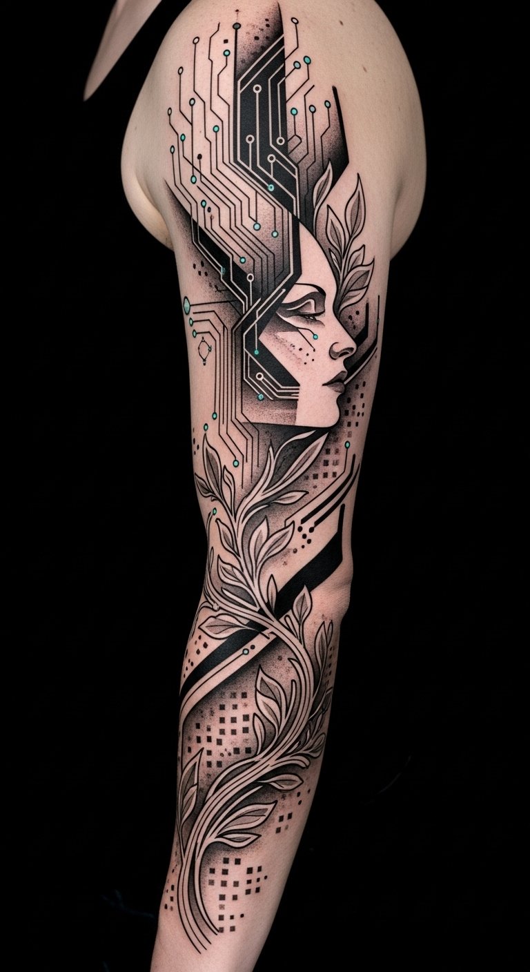 Thick blacks and negative space create drama and clarity while dotwork and fine lines add intimate detail—together they evoke empowerment and bold self-expression. Ideal placement is the full arm for a continuous, statement-making piece that wraps the wearer’s identity in striking contrast and movement.