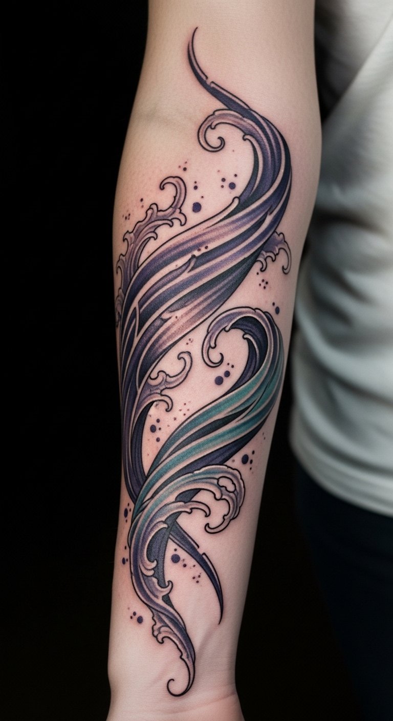 This concept uses the ribboned motion and aquatic tones to symbolize continuous change, emotional flow, and personal liberation; placed along the forearm it interacts with gestures to amplify the sensation of movement, conveying confidence and a living connection between body and art.