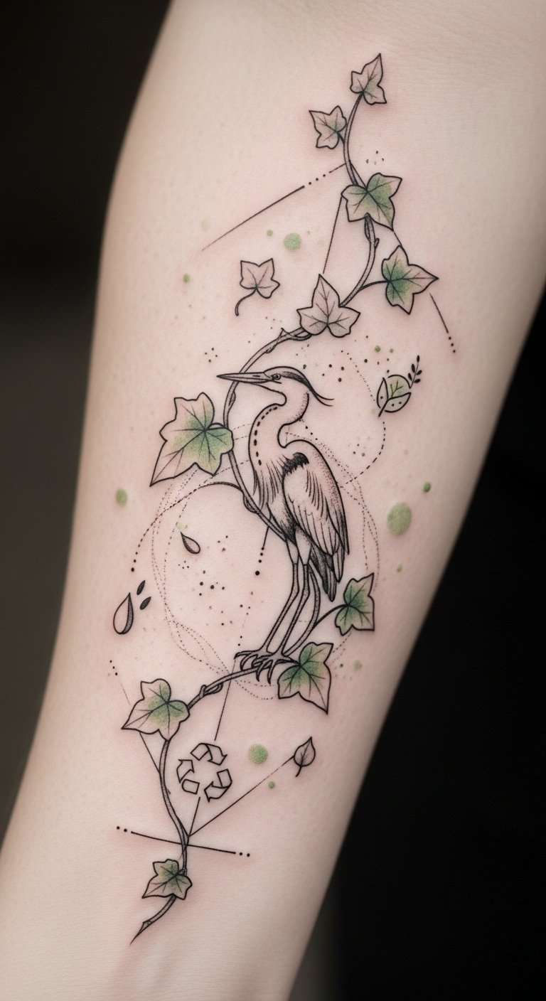 The design symbolizes a harmonious blend of self-expression and environmental respect: the ivy represents growth and resilience, the heron embodies grace and patience, and the hidden seed and leaf symbols quietly signal commitment to sustainable choices.