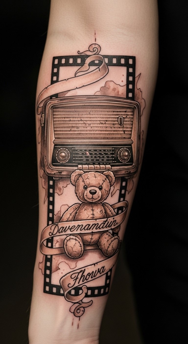 These designs celebrate freedom by honoring your personal history, allowing you to wear your memories proudly on your skin. This design blends personal relics and retro media to symbolize continuity between past and present: the radio represents shared stories and music that shaped identity, the teddy bear evokes childhood comfort and innocence, and the ribboned name ties memory and personhood together.