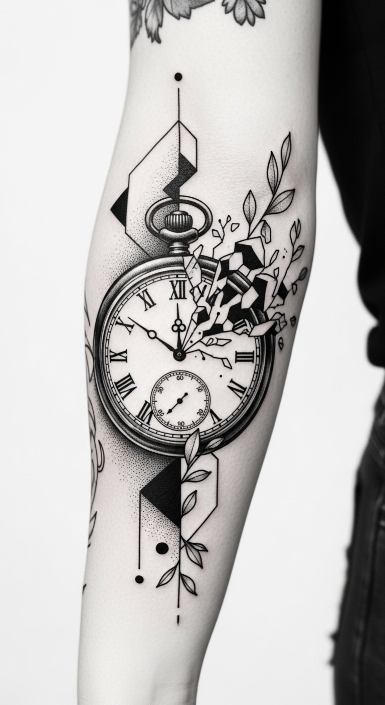 This design symbolizes the interplay between time and growth: the pocket watch represents memory and fleeting moments, the shattered face suggests transformation, and the vines signify renewal and resilience. Emotionally it balances nostalgia with hope, offering a contemplative yet empowering mood. Ideal placement is the forearm for visibility and flow along the arm, or the upper back for a larger, centered composition where the intricate details can be appreciated.