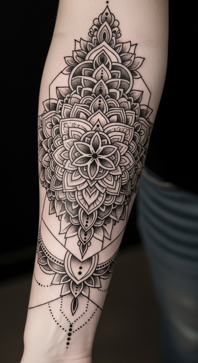 The design emphasizes inner equilibrium (central seed-of-life) and outward growth (radiating mandala and mirrored bands), evoking calm, clarity, and personal evolution; best placed along the forearm to follow natural lines of movement, visible yet adaptable for concealment or extension.