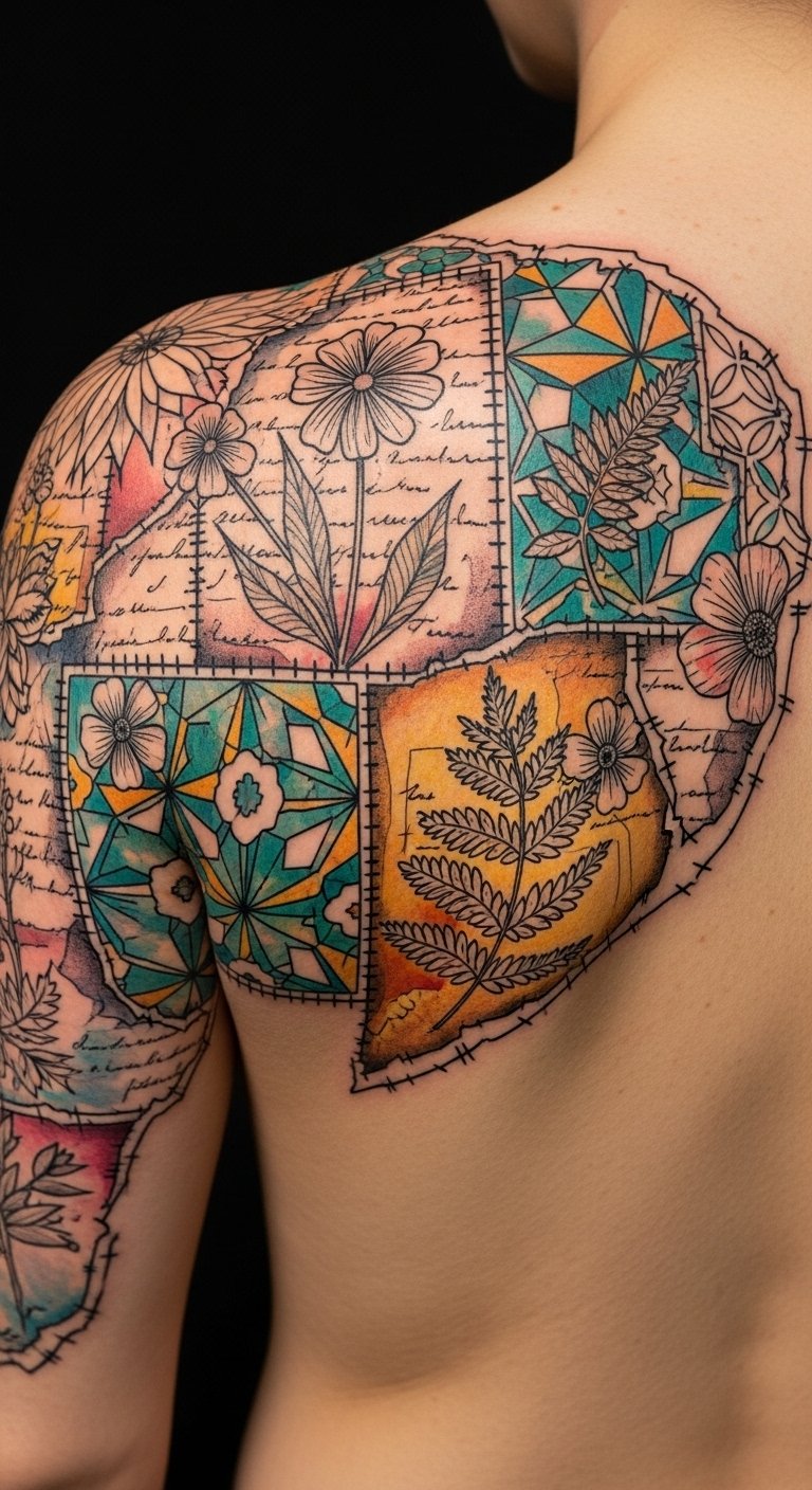 The imagery symbolizes a life stitched from diverse experiences—botanical elements for growth, geometric tiles for structure, and faded script for memory—evoking nostalgia, resilience, and creative freedom; emotionally it feels like a reclaimed collage of self.