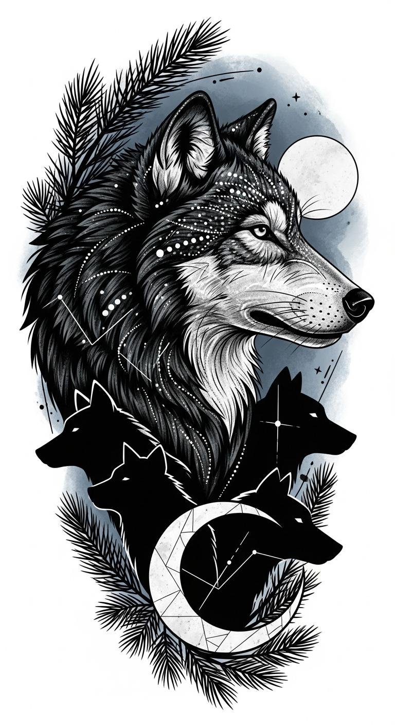 Embrace its protective nature and leadership qualities as you navigate social dynamics, using survival strategies rooted in emotional depth to forge your unique path. This design emphasizes those themes: the realistic head conveys personal strength and leadership, the pack silhouette and moon represent social bonds and intuition, pine branches ground the piece in nature, and the geometric accents hint at inner structure and independence.
