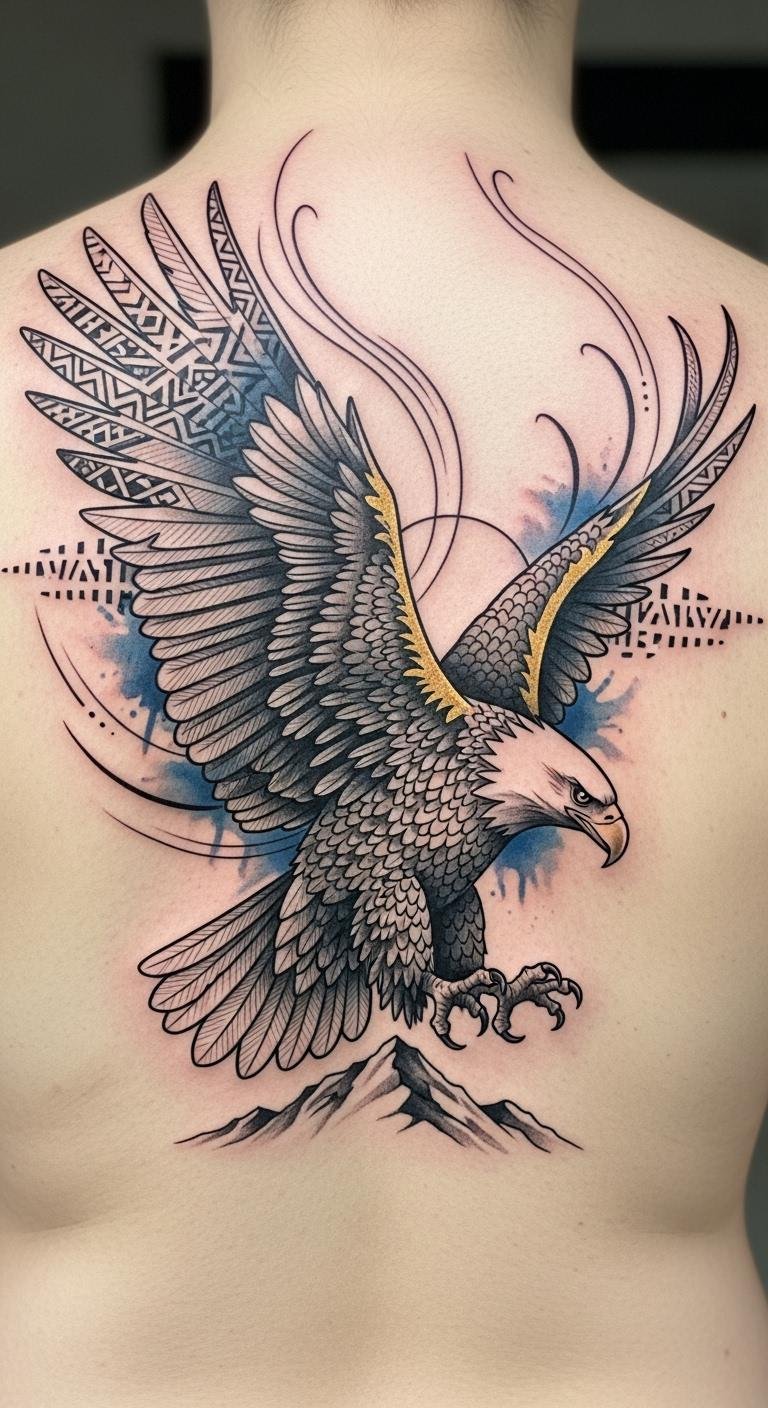 This tattoo combines bold linework and delicate color to evoke confidence and clarity; the upward motion and sun element emphasize aspiration and renewal, while tribal accents nod to heritage and protection.