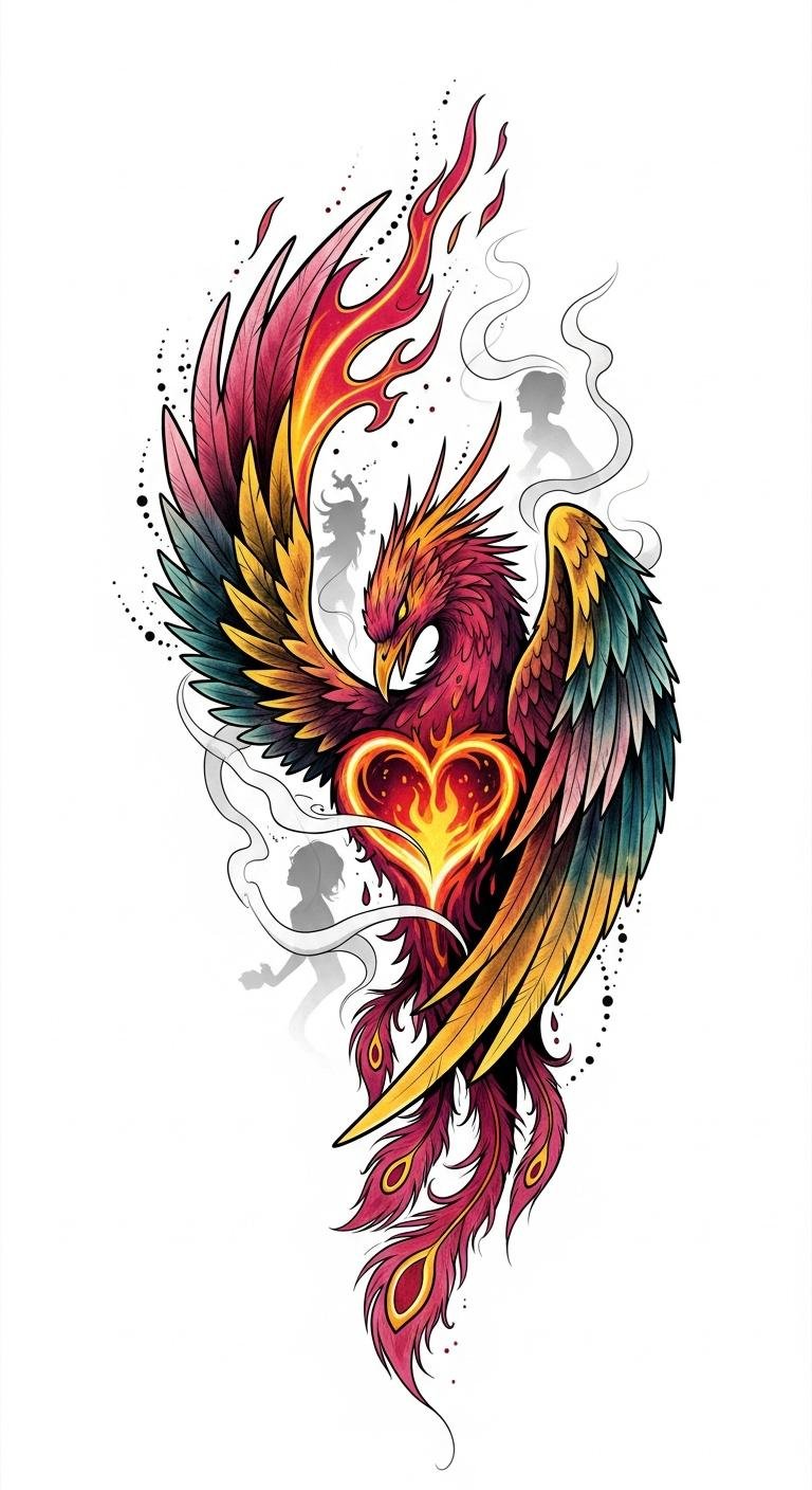 The phoenix embodies rising and growth while the broken chains represent breaking boundaries; the thorned rose and laurel balance vulnerability and victory, and the crimson/gold watercolor conveys passion and courage.