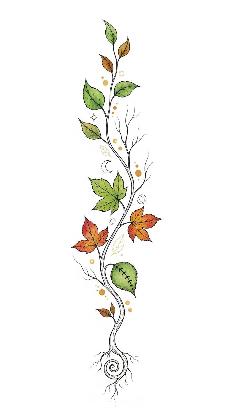 This placement and design emphasize cyclical growth and inward reflection; the inner forearm or ribcage keeps the piece intimate and personal, while the flowing vines and stars evoke tenderness, guidance, and a quiet, steady emotional resonance.