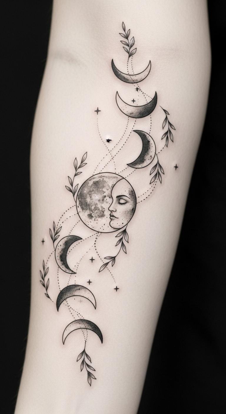 The design layers botanical softness and celestial elements to symbolize growth, resilience, and personal cycles; metallic tones and watercolor convey warmth and intimacy; dotwork and negative space create quiet depth and timeless elegance.