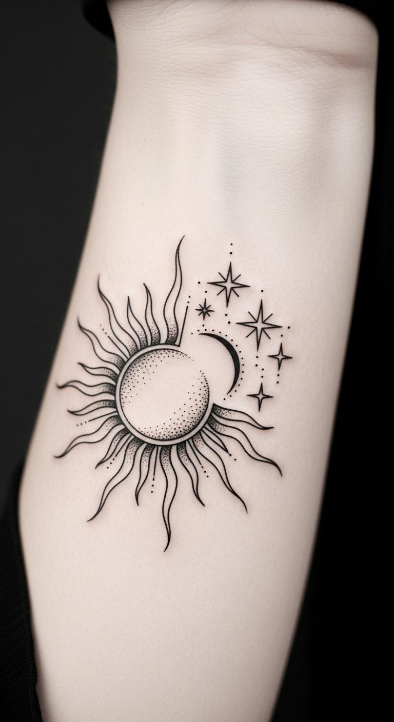 A tattoo of these celestial bodies can signify your journey toward freedom, resilience, and transformation, empowering you to embrace change and step boldly into the light of fresh opportunities. This design balances strength and delicacy—the bold sun for renewal and the gentle stars for guidance—evoking steady optimism and inner courage; ideal on the inner forearm or shoulder where it can be seen as a personal talisman or placed behind the ear for a private reminder.