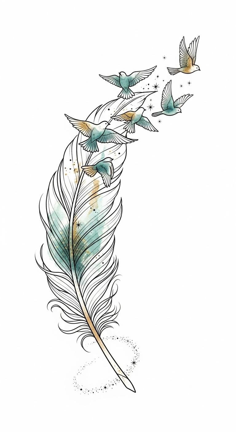 Each delicate stroke can represent your resilience, encouraging you to embrace transformation and liberation, celebrating the beauty of your unfolding story. This design blends motion and serenity—birds emerging from the feather suggest release and progression, the watercolor hues evoke calm transcendence, and the stardust spiral hints at spiritual guidance;