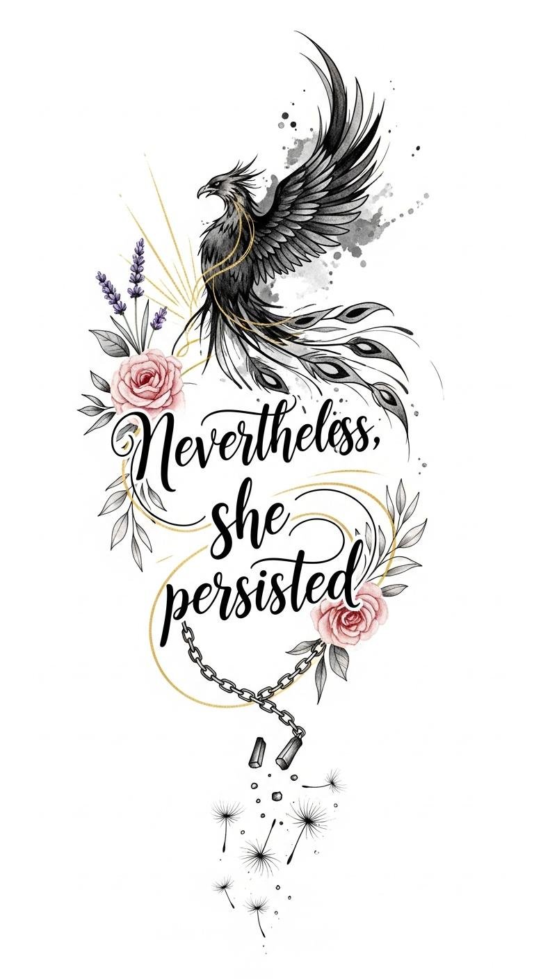 Resilience shines brightly in the phrase “Nevertheless, she persisted,” a powerful demonstration of the strength women embody in the face of challenges. Your journey of self-discovery unfolds through resilience stories, celebrating women’s solidarity and strength through adversity. These transformative experiences inspire personal growth, healing through art, and overcoming obstacles, creating a tapestry of empowerment narratives that remind you—your persistence is a profound statement of freedom. The phoenix symbolizes rebirth and relentless renewal while the dissolving chains and dandelion seeds convey liberation and fragile beauty turning into motion; watercolor florals soften the composition to evoke healing and solidarity. Emotionally the design reads as both defiant and tender—strength tempered by grace. Ideal placement: forearm for visibility and daily affirmation or along the ribcage for a more intimate, protective placement.