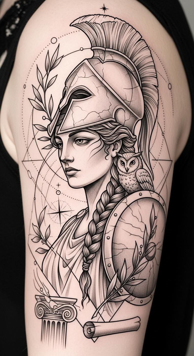 Let Athena guide you toward your true potential and bold decisions. The design emphasizes symbols of wisdom (owl, olive branch), strategy (compass elements, shield), and classical dignity (helmet, column fragments); emotionally it evokes calm confidence and resolute empowerment.