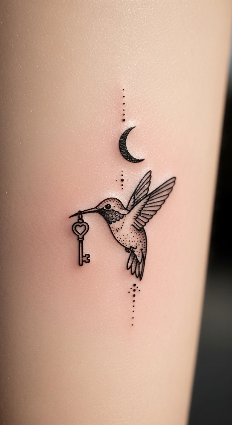 The hummingbird with a key and crescent moon symbolizes curiosity, unlocked potential, and quiet guidance; its tiny scale keeps the sentiment intimate and personal, eliciting a gentle, secretive joy rather than bold declaration.