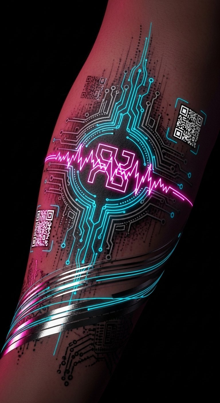 This forearm placement allows the circuitry to follow muscle lines, the central glyph over the inner wrist acting as a personal core or signature, QR fragments as hidden messages to decode, and the glowing palette evokes curiosity and confidence—symbolizing the merge of inner identity with external networks, evoking empowerment, futurism, and intimate play between secrecy and display.