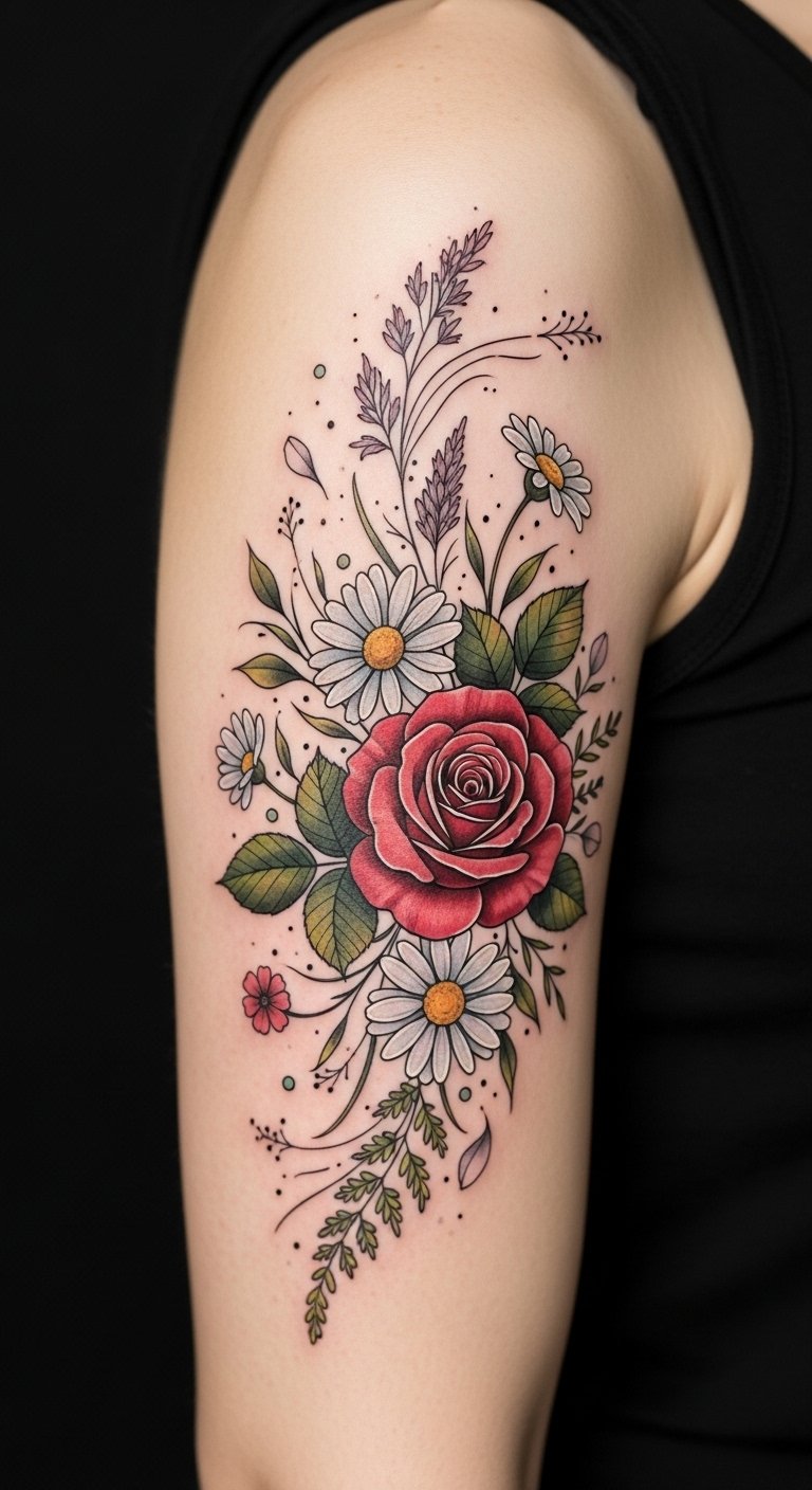 Each bloom carries profound flower symbolism, expressing emotions and personal stories—delicate wildflowers evoke freedom and serenity, the bold rose signifies passion and resilience, and the whimsical daisy suggests innocence and joy;