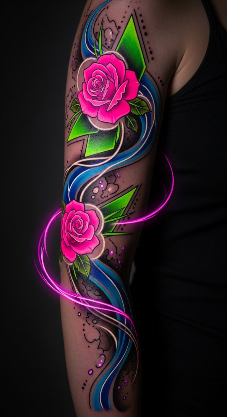 Embrace your individuality and let your skin glow with radiant artistry! This composition uses neon colors to symbolize liberation and self-expression, evoking exhilaration and confidence; the flowing sleeve placement follows musculature to create movement, with bolder elements on the upper arm for visibility and subtler accents toward the wrist for intimacy, making it both a public statement and a personal talisman.